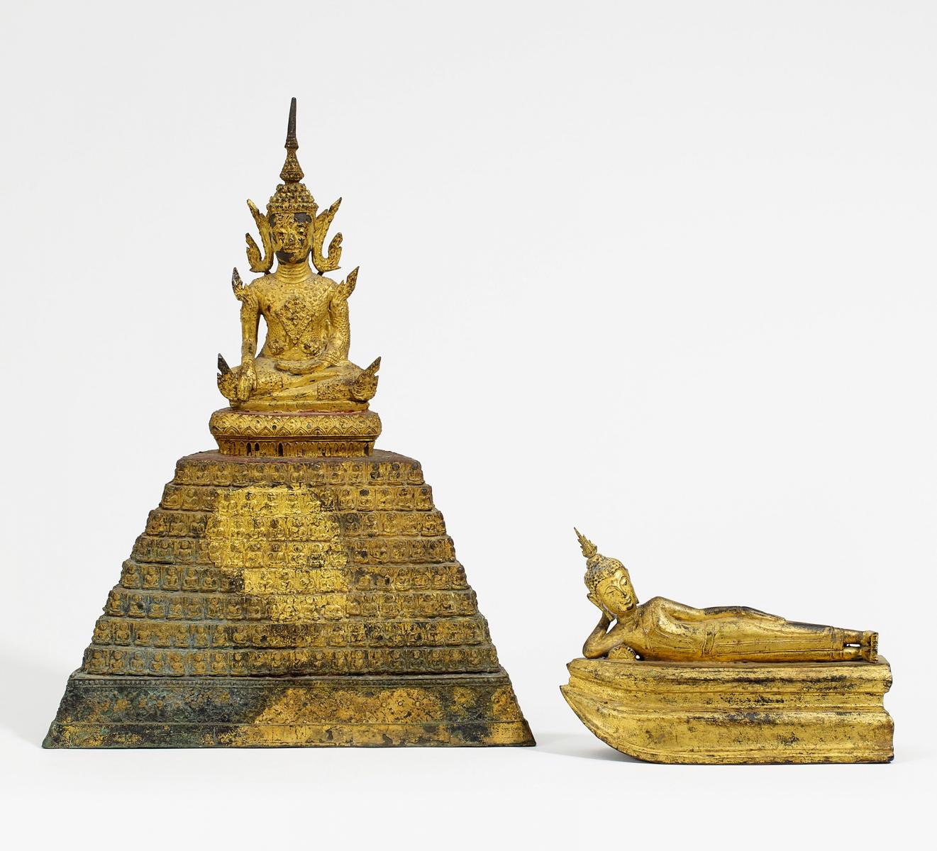 Zustand A/B. Beilage: Ruhender Buddha (Phra Phuttha Saiyat). Holz mit Lackvergoldung. Thailand. L.17,5cm. Zustand A/B.