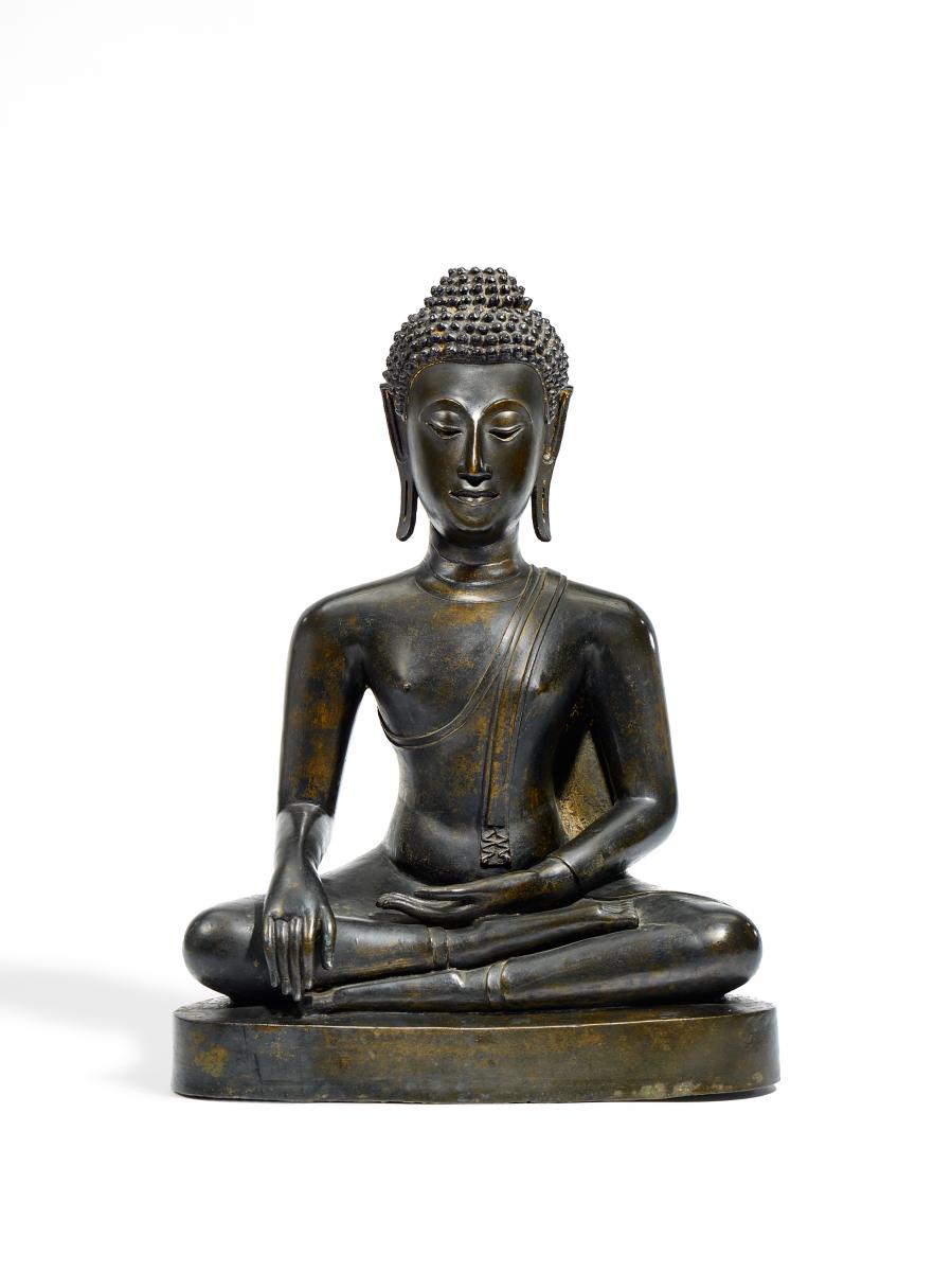 Beschreibung: Buddha im U-Thong-Stil sitzend in virasana auf einer Sockelplatte, die rechte Hand in