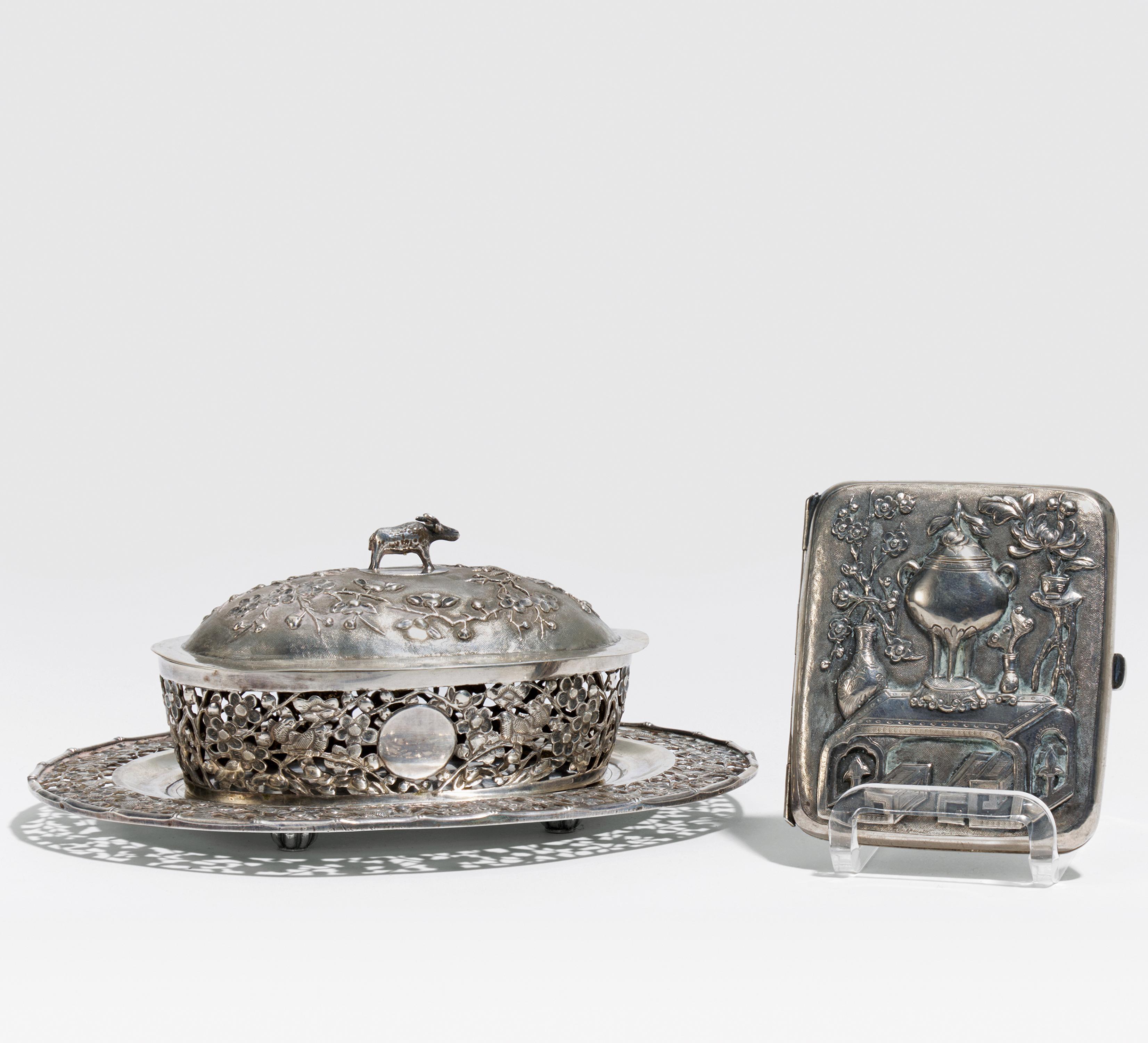 Technik: Export-Silber in Repoussé, Schale und Teller in Durchbrucharbeit. Glaseinsatz fehlt. Etui innen vergoldet.