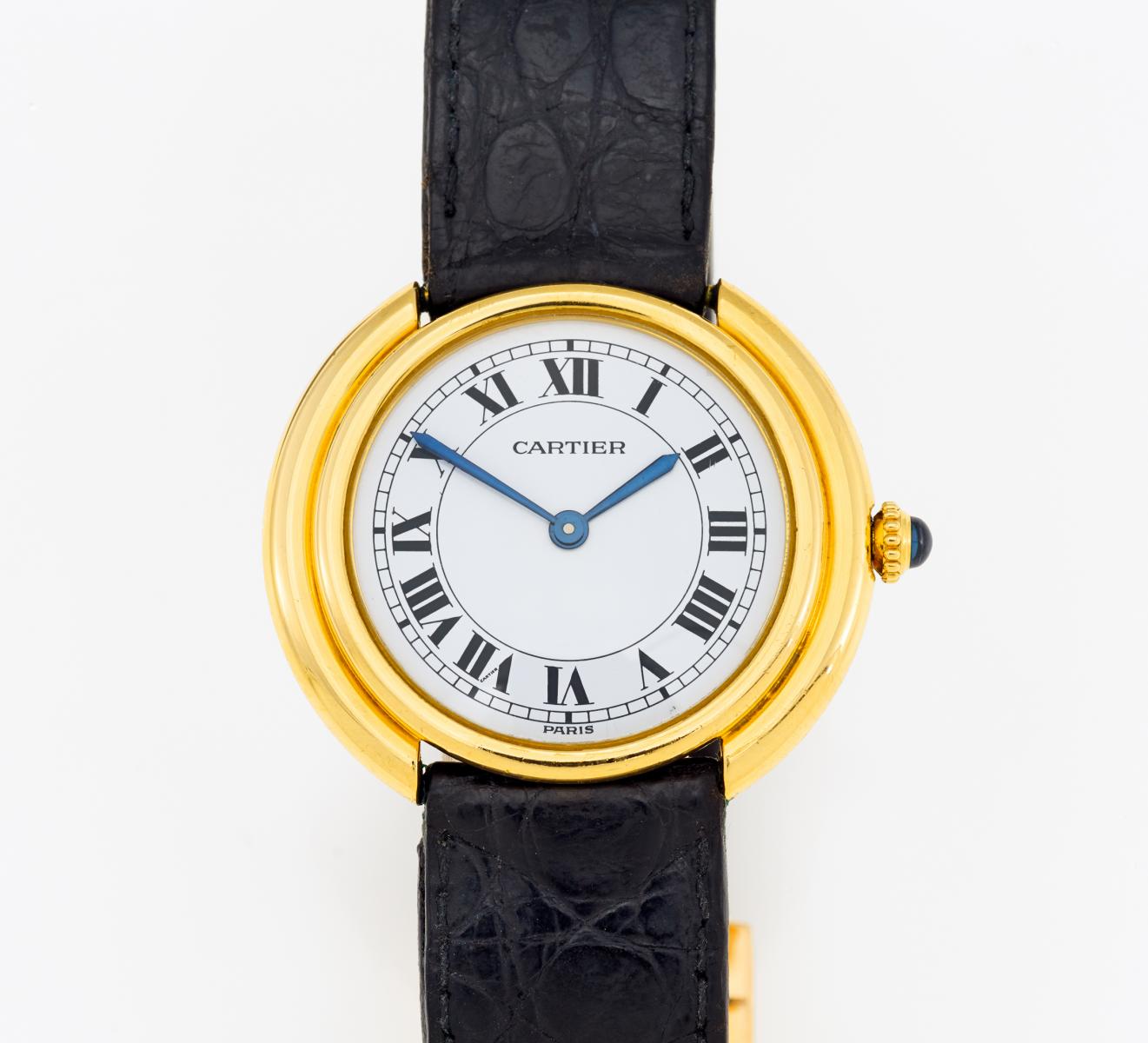 Gehäuse/Armband: 750/- Gelbgold, schwarzes Lederband, Cartier-Faltschließe 750/- Gelbgold, Zffbl. lackiert, bedruckt, Zeiger gebläut.