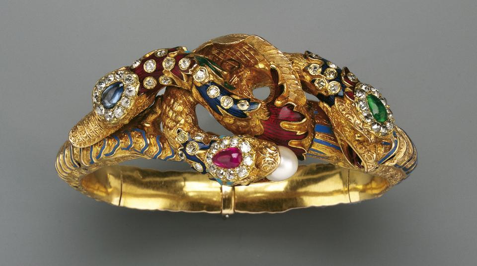 750/000 Gelbgold, Amtspunze, Email, Gesamtgewicht: 62,4gr. Innenmaß 6,5cm. Ein tropfenförmiger Rubin- und Smaragd-Cabochon, je ca. 0,30ct58 Altschliff-Diamanten, zus. ca. 1,70ct.Eine weiße tropfenförmige Orientperle 6,3x9,20mm.