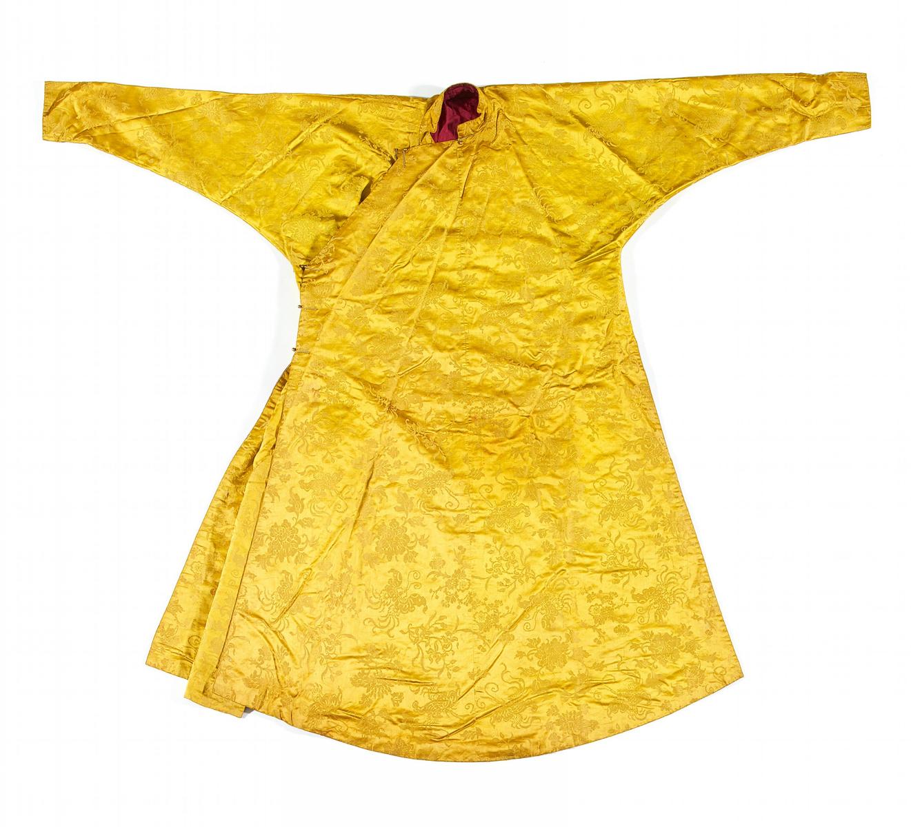 Technik: Seidendamast. Außen: Gelb, Rapport 33cm, Schmetterlinge, Blumen der vier Jahreszeiten. Futter: Rot, Schmetterlinge und Päonien. Dünne Wattierung.