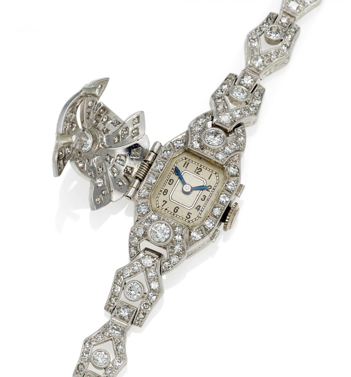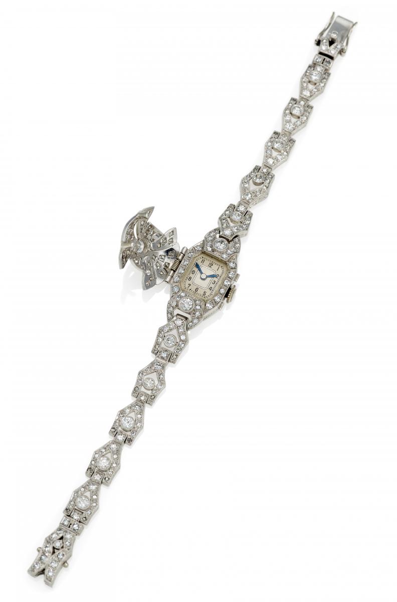 Gehäuse/Armband: Platin, Zffbl. bedruckt, Zeiger gebläut, vielzählige Diamanten im Alt-, Rosen- und 8/8-Schliff zus.ca. 3,4ct K-L/ VS-SI.