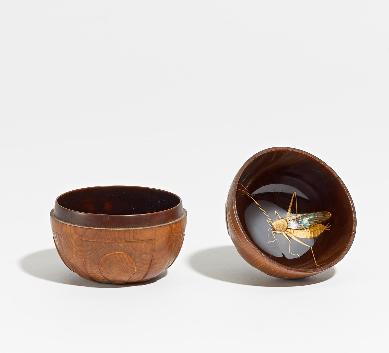 Beschreibung: Im Deckel in kin hira- bis takamakie mit aogai-Einlage Grille mit langen Fühlern.