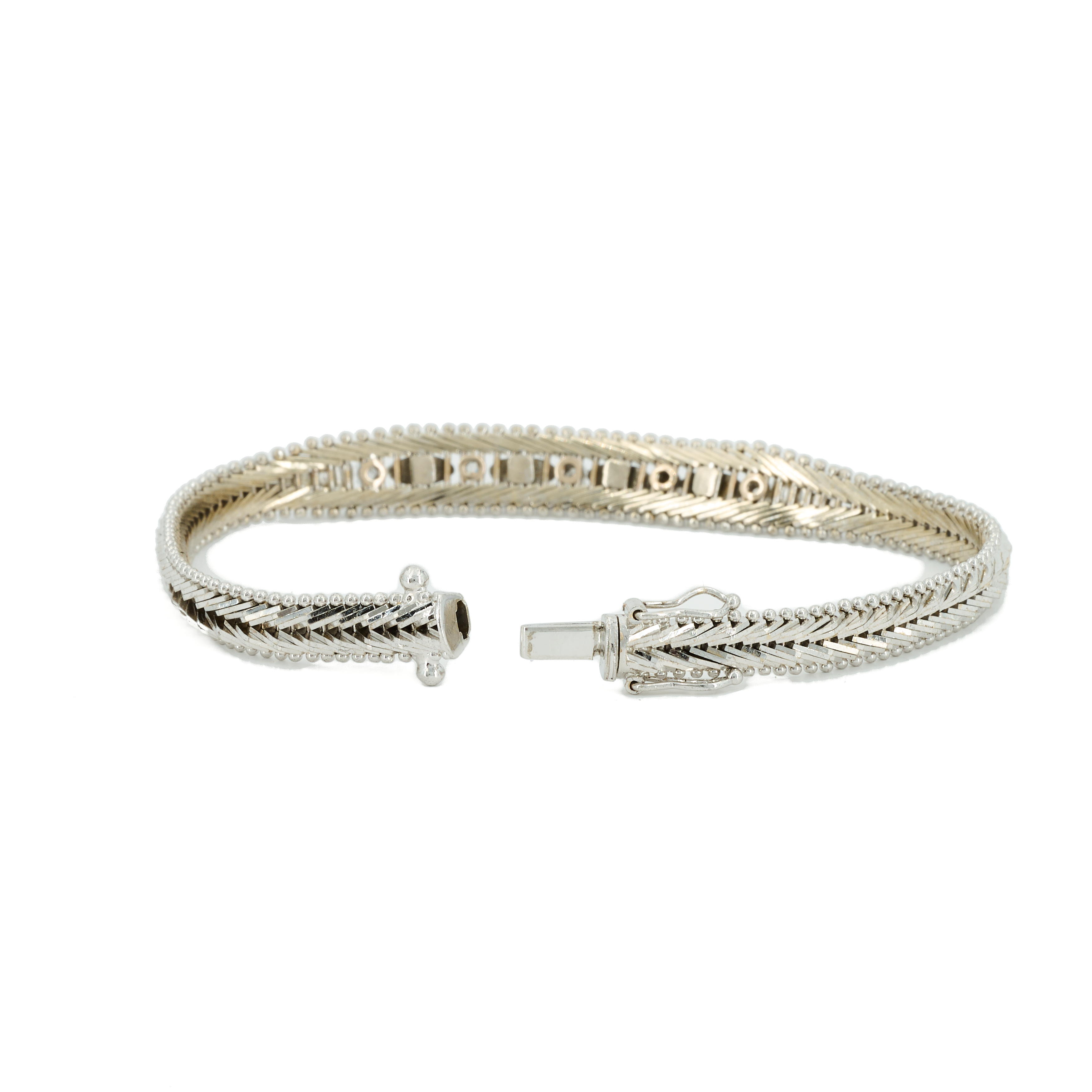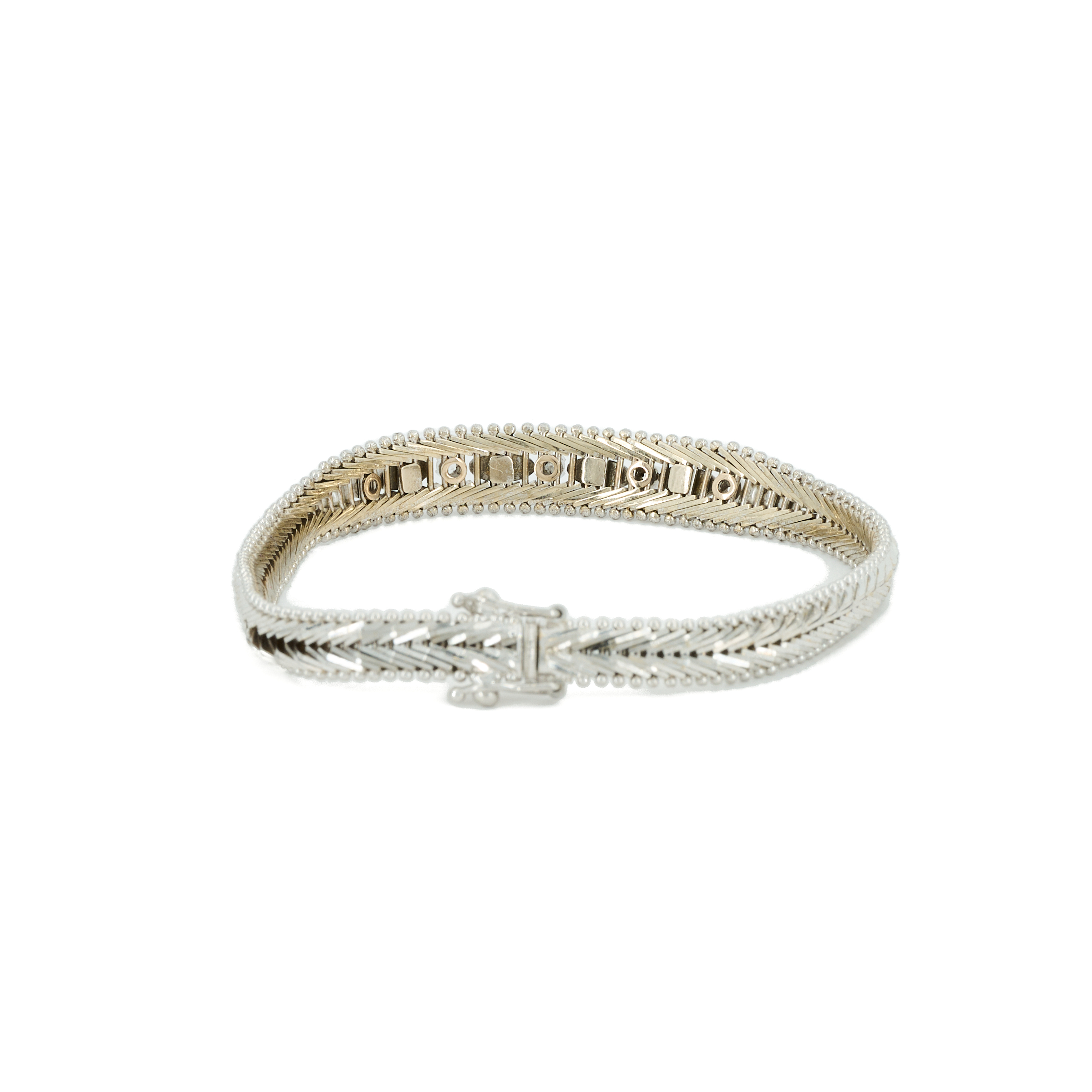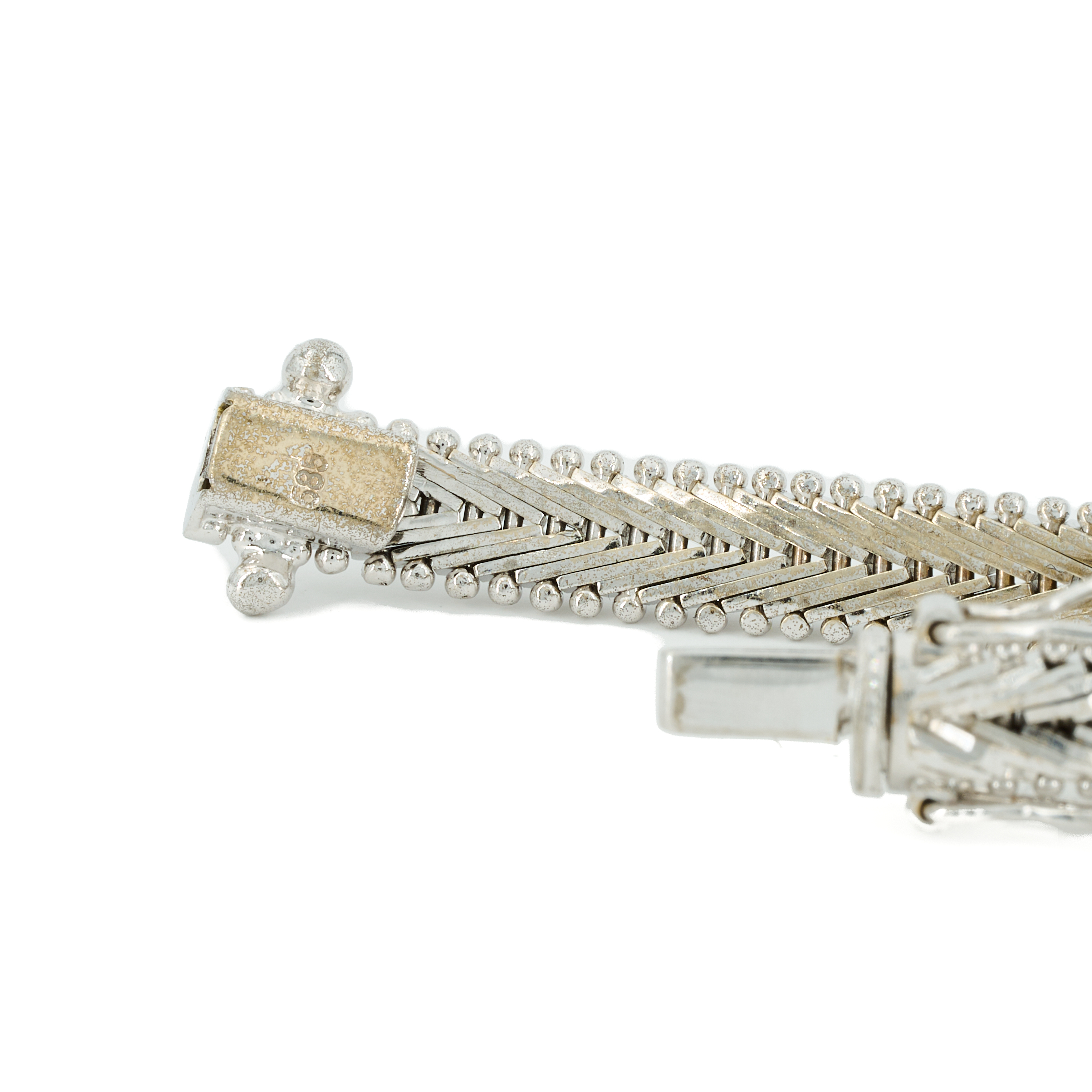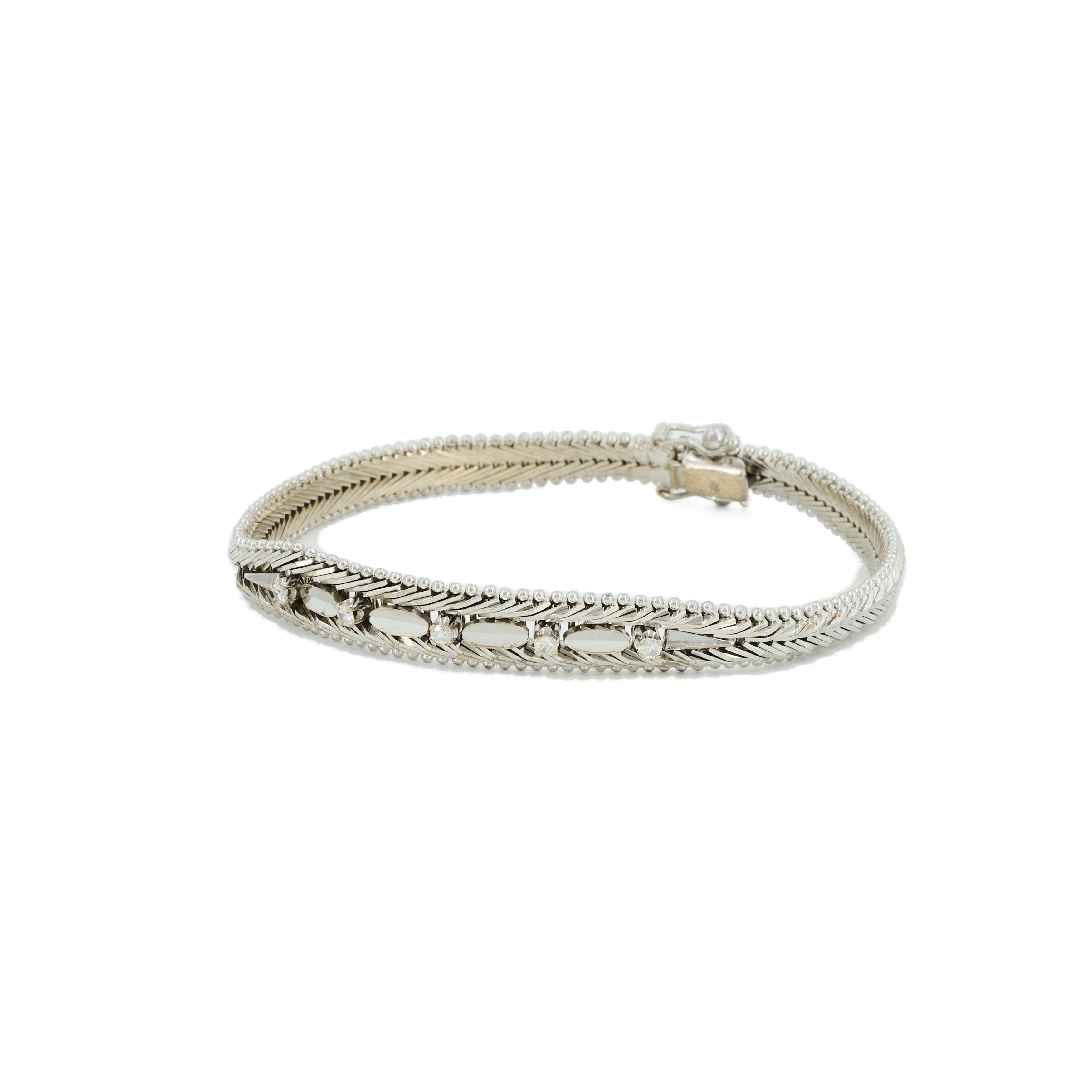 Beschreibung: Fein facettiertes Gliederarmband aus Weißgold, im Verlauf zur Mitte hin breiter werdend, mit fünf Diamanten besetzt.