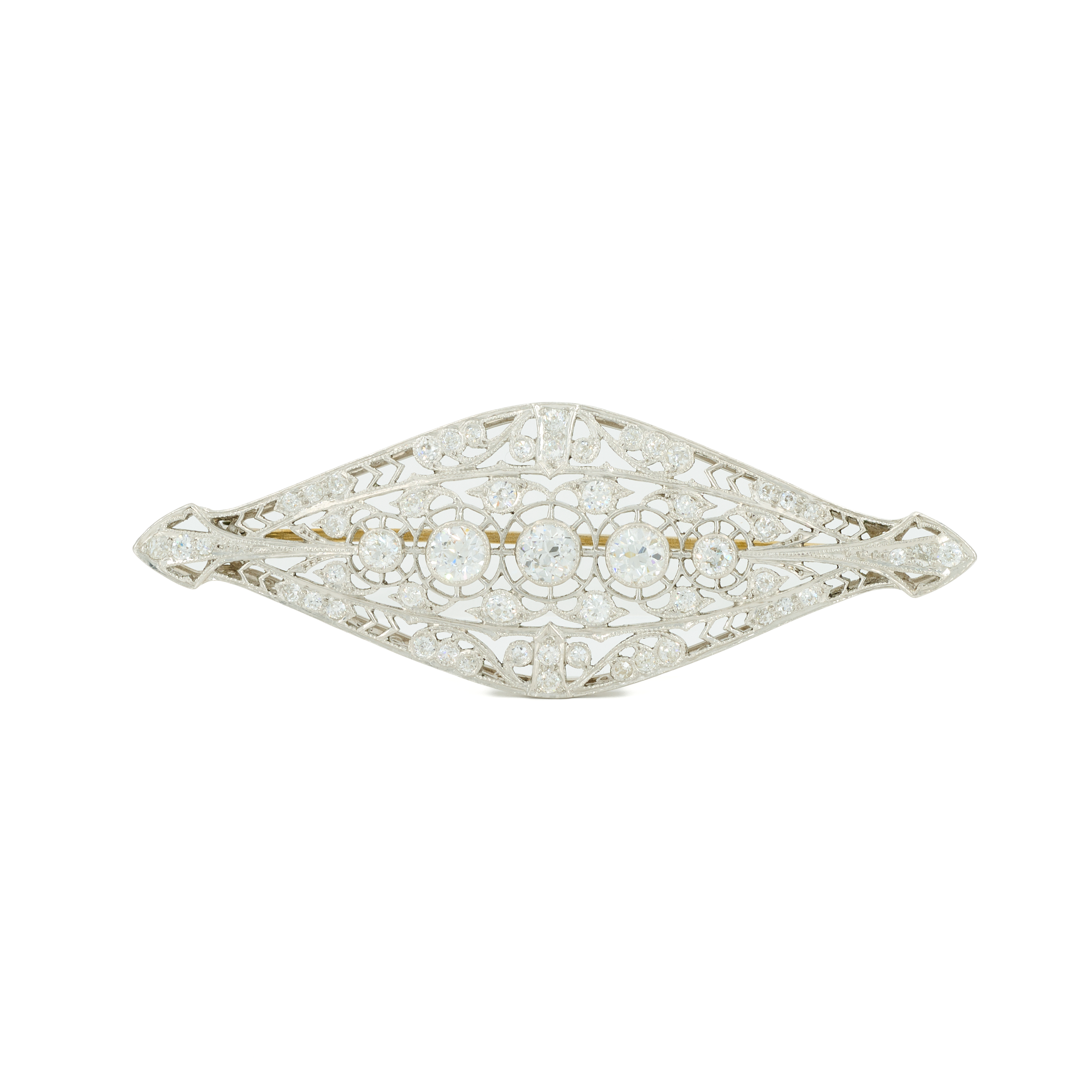 Beschreibung: Rautenförmige Brosche aus Platin im Stil des Art Déco, mit Diamantbesatz und feinen Millegriff-Verzierungen.