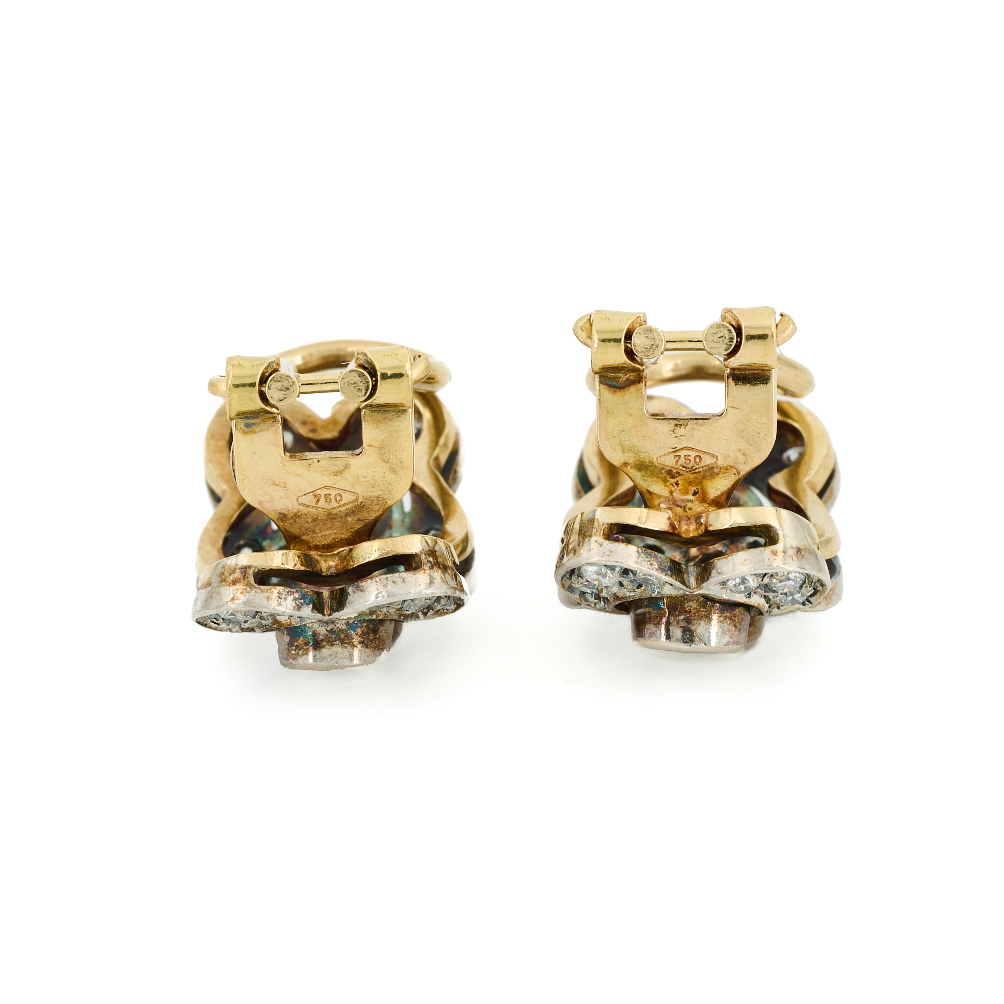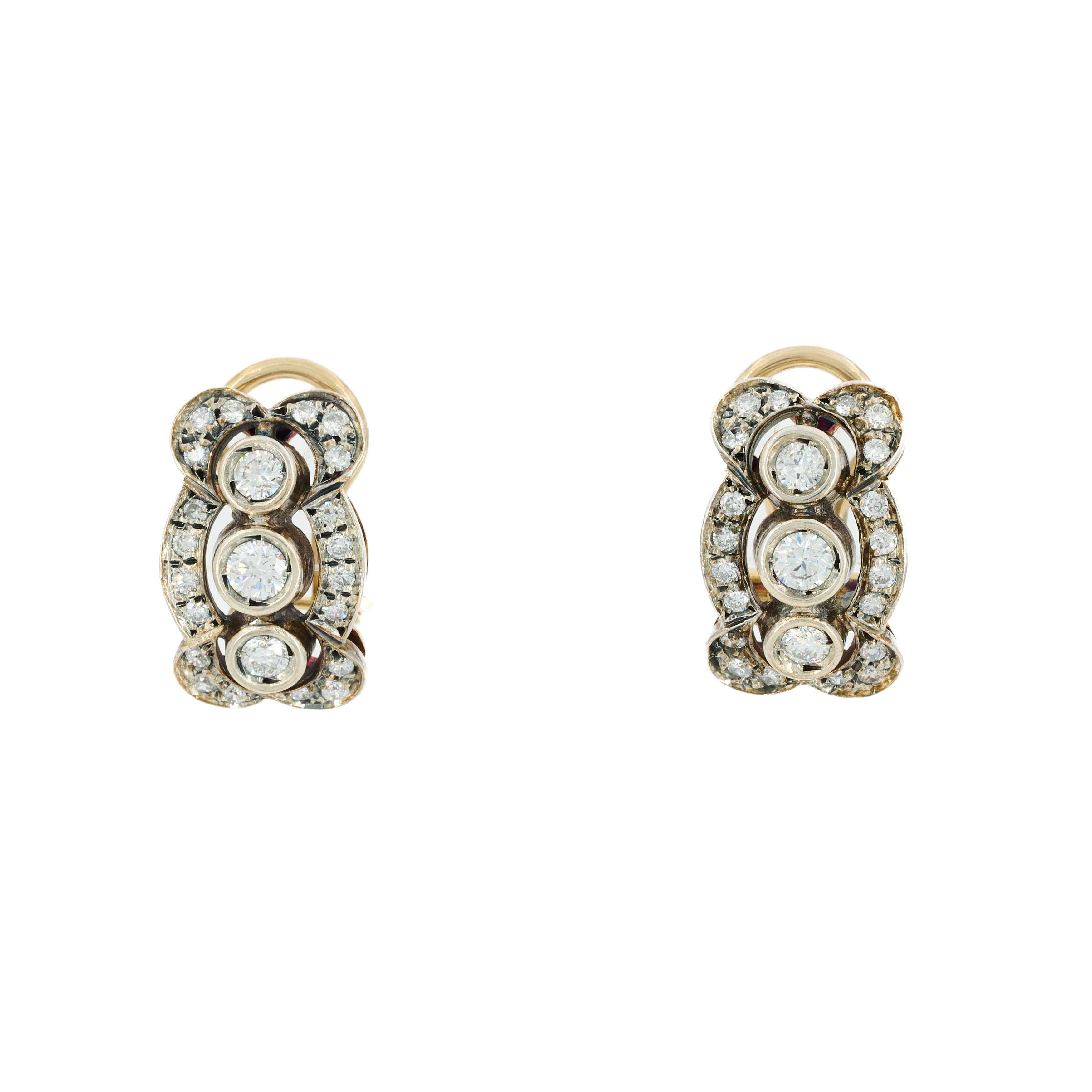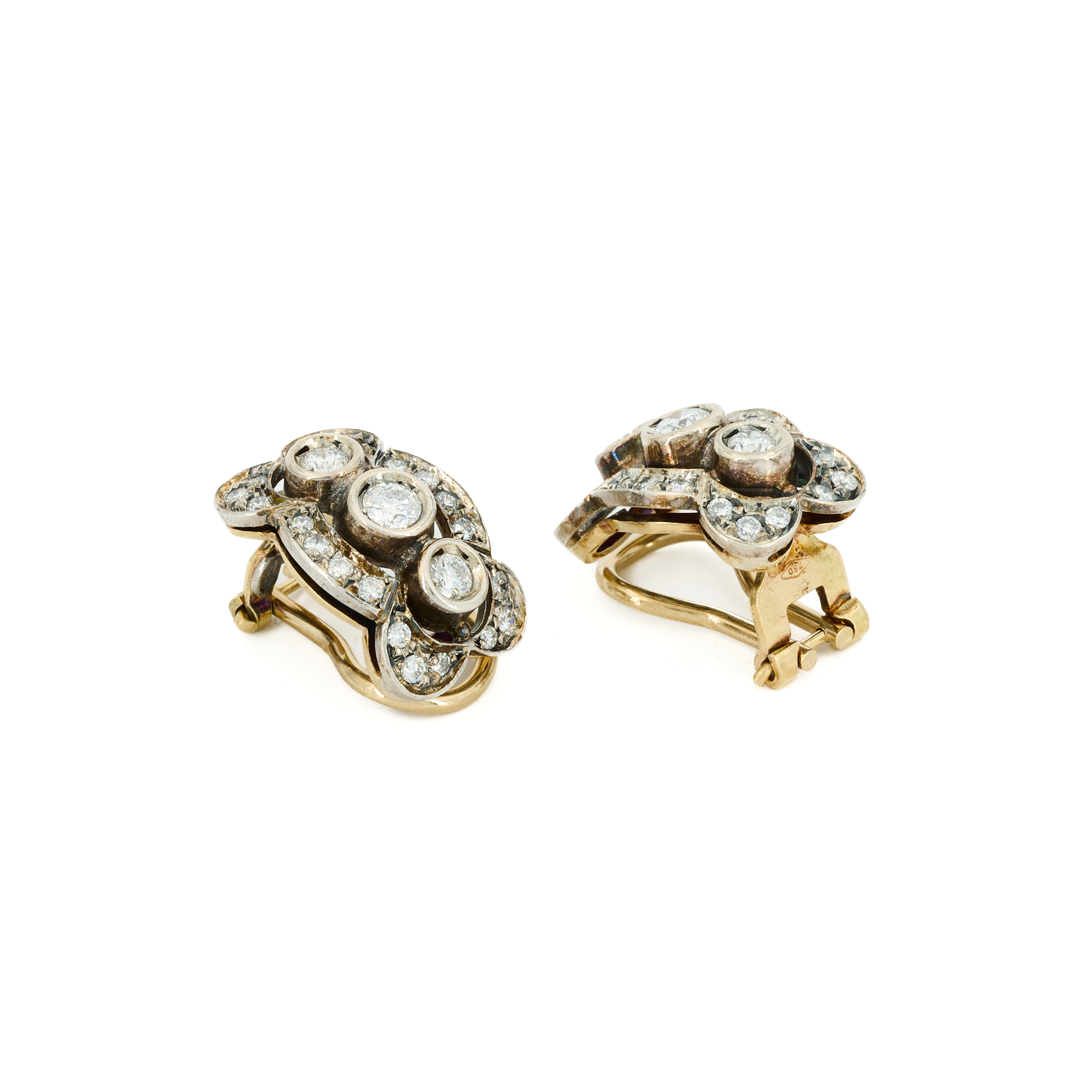 Beschreibung: Ohrschmuck im Stil des späten Art Déco aus Silber und Gelbgold, mit Diamanten besetzt.