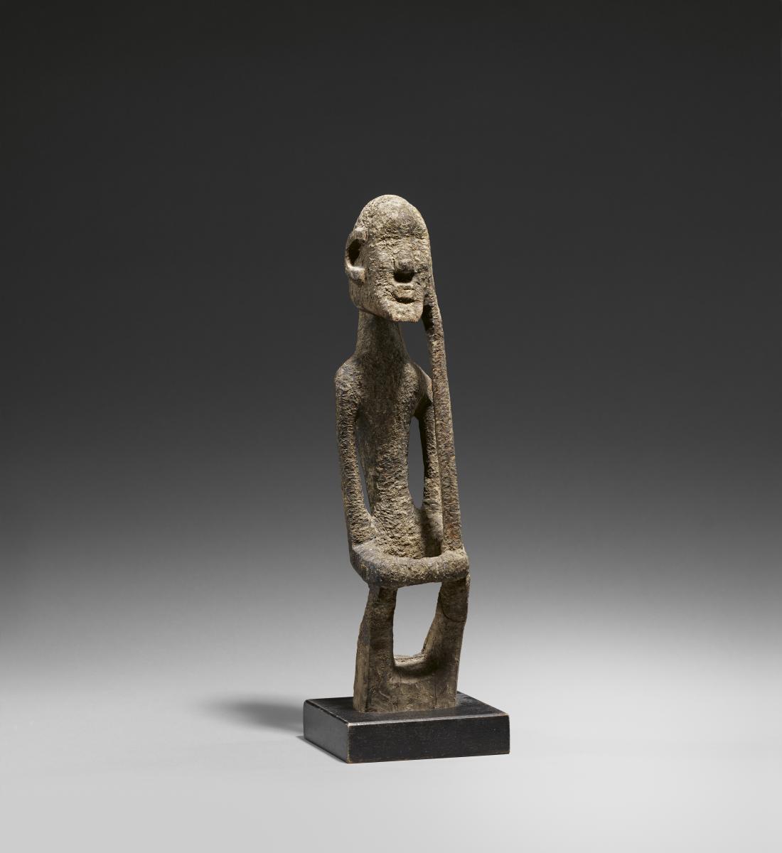 Zu den am besten ethnologisch erforschten Völkern Afrikas gehören die Dogon, die seit Jahrhunderten an den Hängen und auf den Ebenen eines Felsplateaus südlich des Niger siedeln. Die große Zahl ihrer unterschiedlichsten Statuen entstammen den vielfältigen religiösen Praktiken dieses Volkes. Viele ihrer Skulpturen - wie auch unser typisches Stück - bestechen in ihrer abstrakten Formauffassung, die in diesem Fall dem regionalen Stil Bombu-Toru entspricht. Archaisch wirkt auch diese aus hartem Holz geschnitzte Figur eines Sitzenden. Die ungewöhnliche Haltung der Arme symbolisieren Nachdenklichkeit, aber auch Trauer.