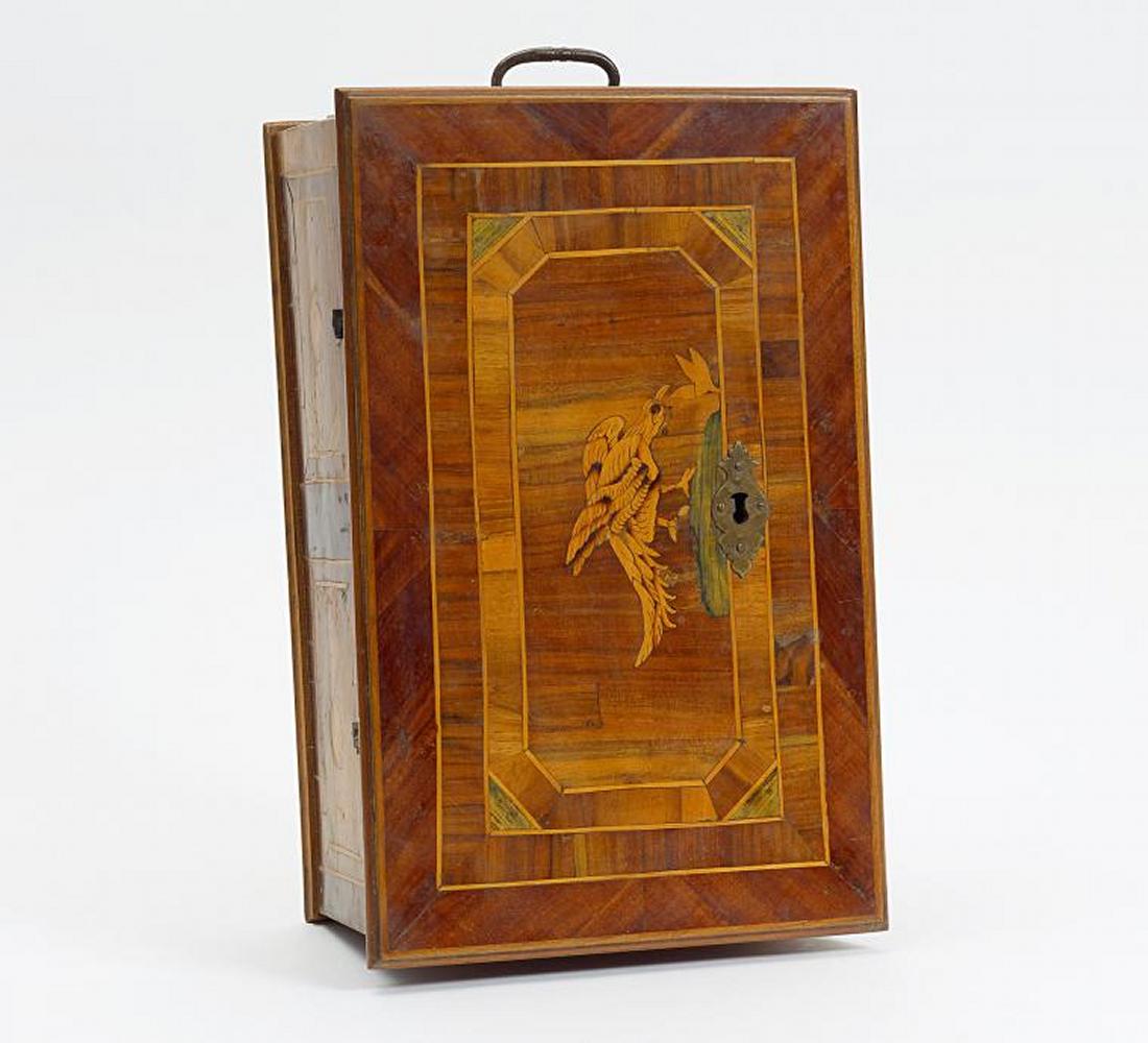 Nussbaum u.a. Hölzer eingelegt. 18x45x29 cm. Zustand B.