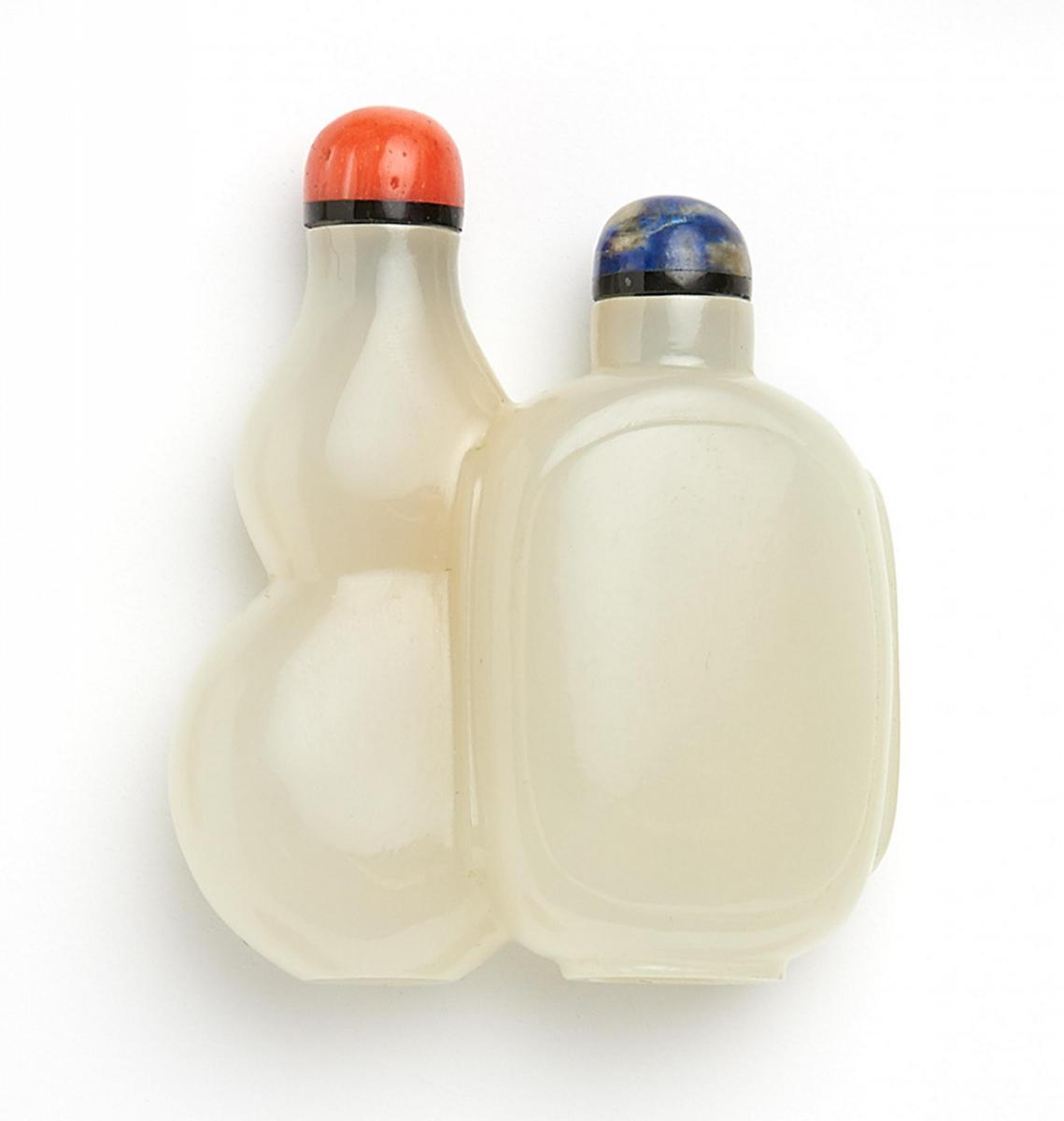 Beschreibung: Eine Kalebassen-förmige und eine rechteckige Flasche miteinander verbunden. Schlichte,