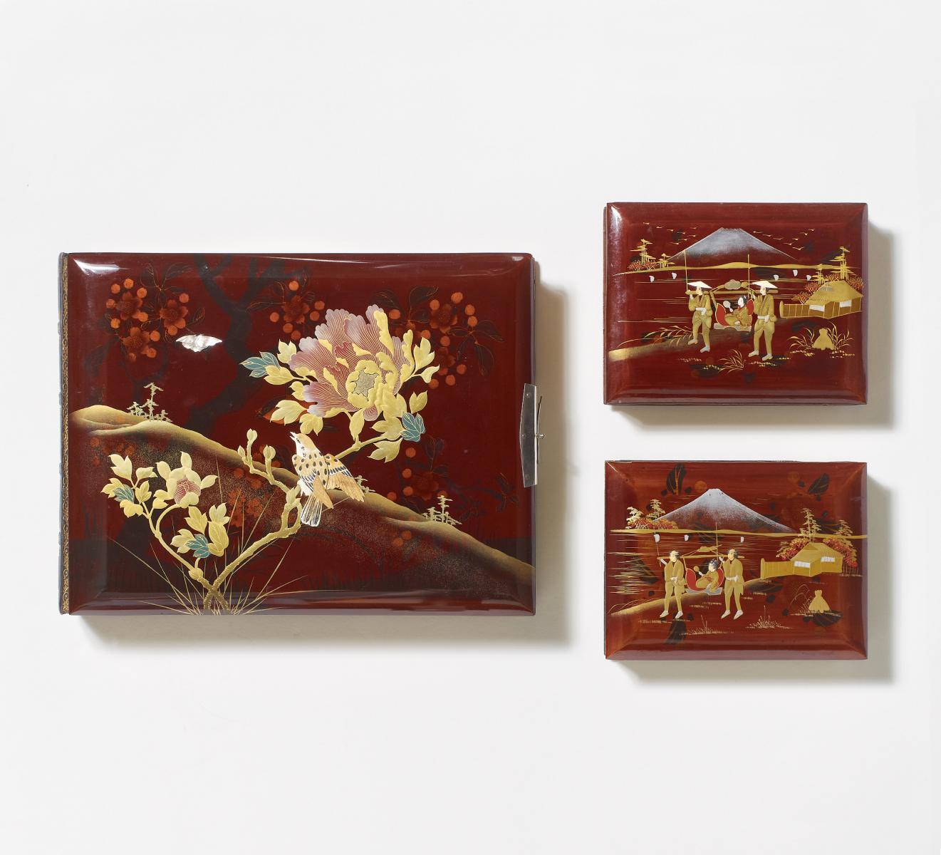 Technik: Deckel lackiert und mit geschnitzten Details aus Bein und Perlmutt.