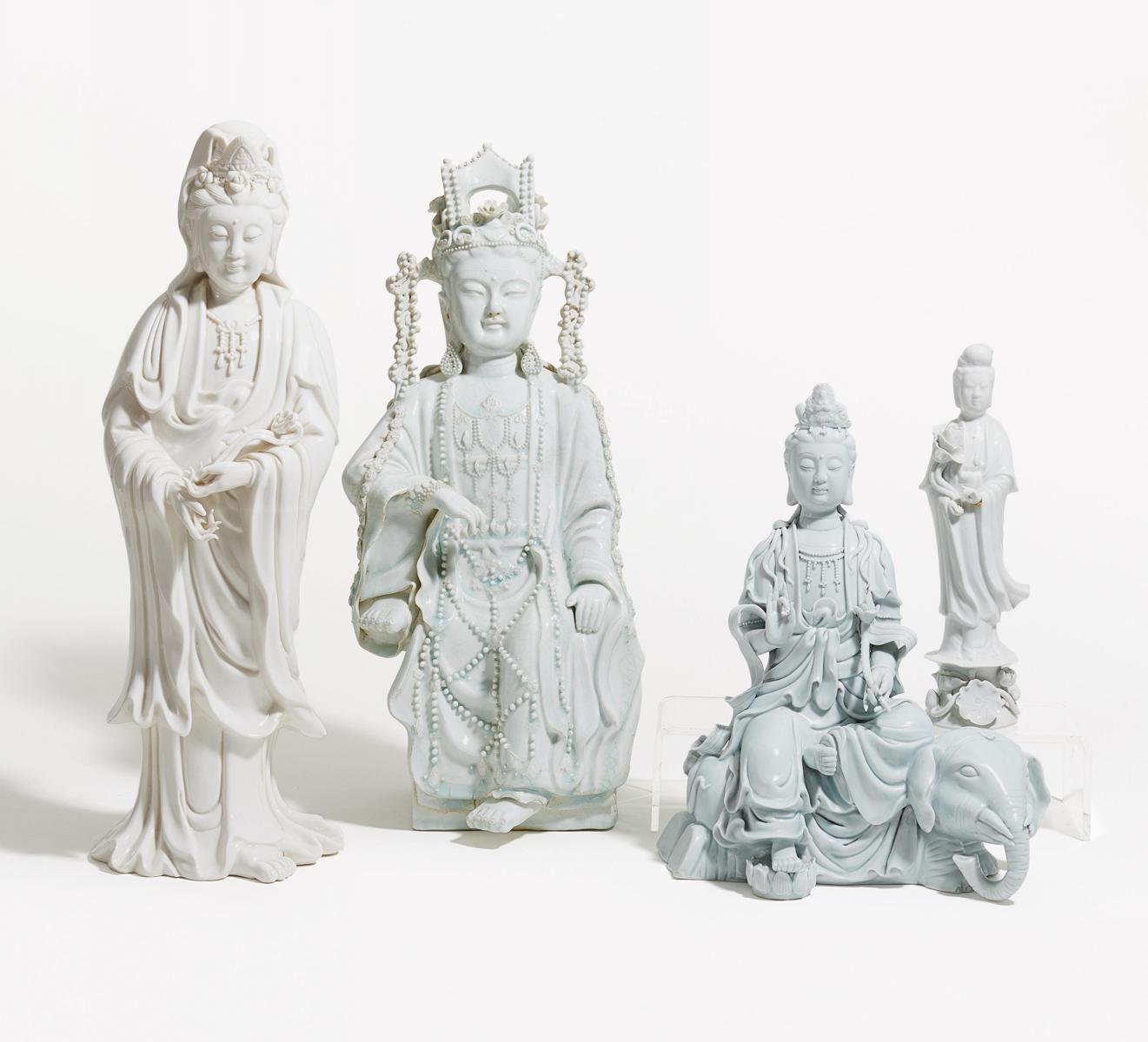 Technik: Blanc de Chine-Porzellan, sitzende Guanyin mit Qingbai-Glasur, Samantabhadra hellblau glasiert.