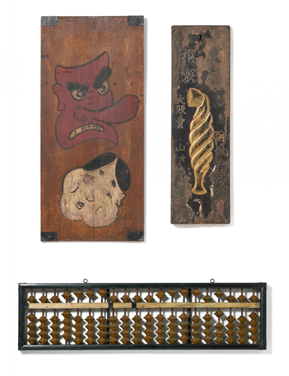 b) Mit Tengu- und Okame-Maske. An den Ecken Metallbeschläge. 86 x 39cm.