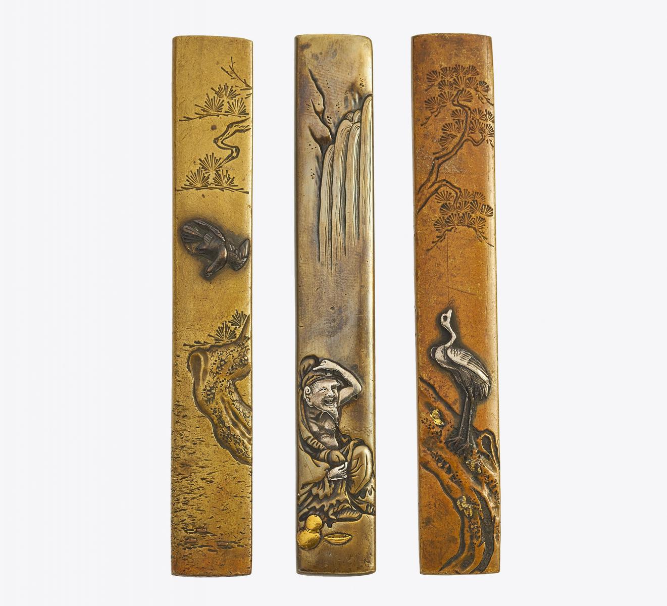 Naoyuki, vgl. H 06907.0. L.9,4cm. b) Sentoku. Adler in Kupfer-Relief über fein gravierter,
