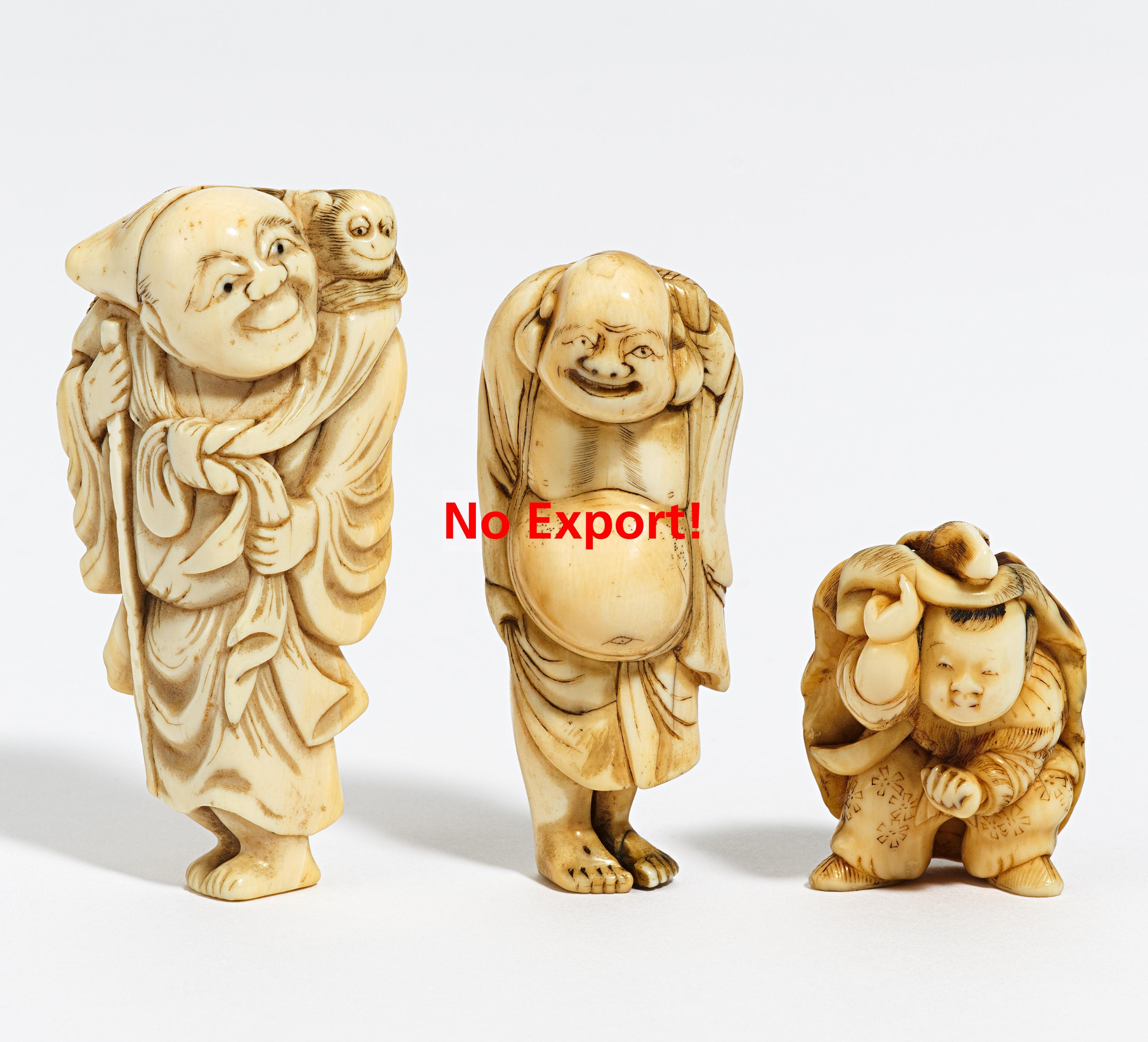 Maße: Sarumawashi H. 7cm, Hotei H. 6,6cm, Enshi mit Hirschhaut H. 4cm.