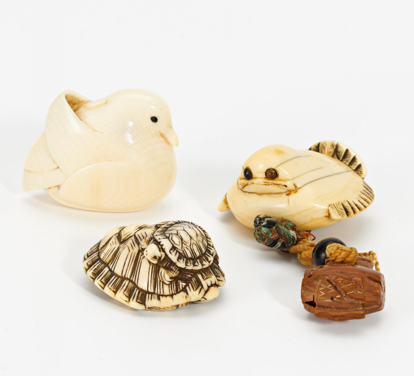 DREI NETSUKE: SCHILDKRÖTEN UND ZWEI VÖGEL.