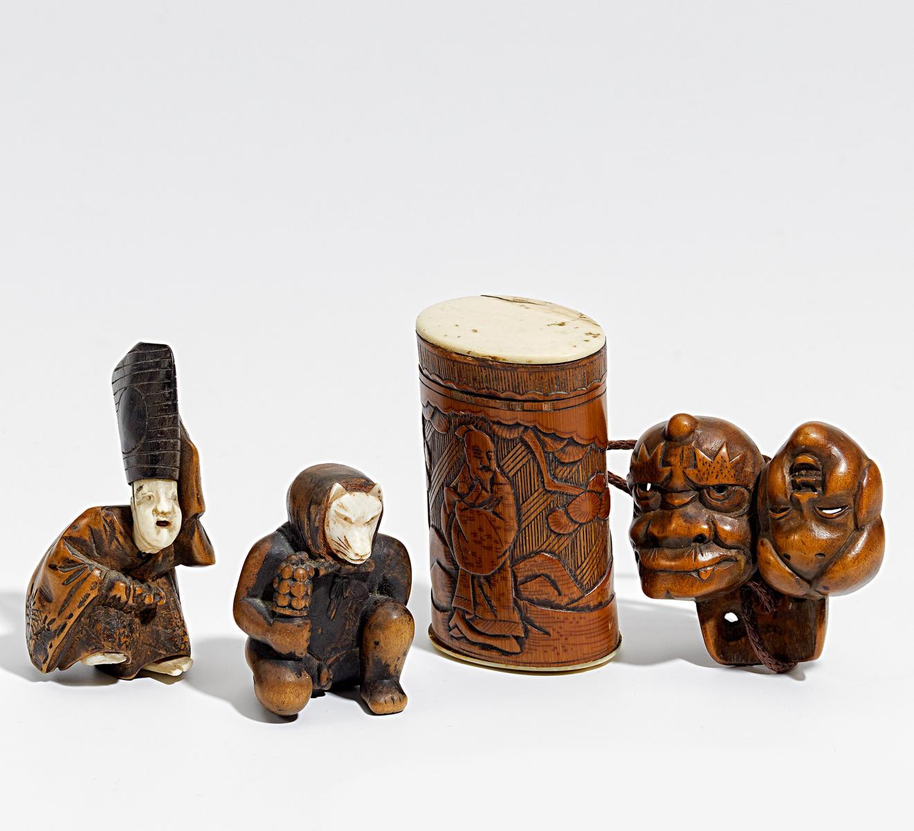 DREI NETSUKE UND KLEINES SAGEMONO.