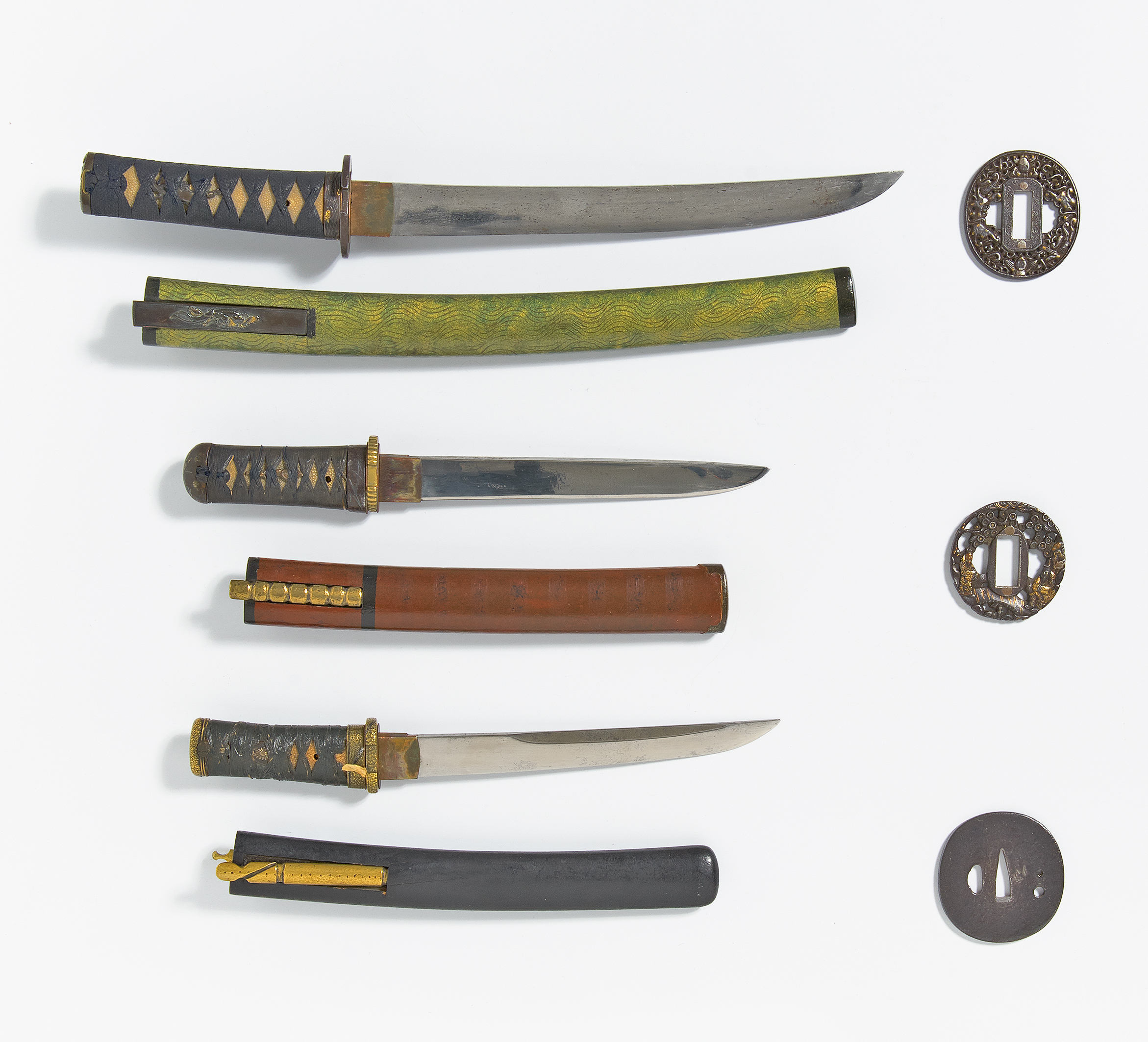 Zustand C. Beilage: Drei tsuba. Eisen. Japan. Zustand D. Teils stark verändert.