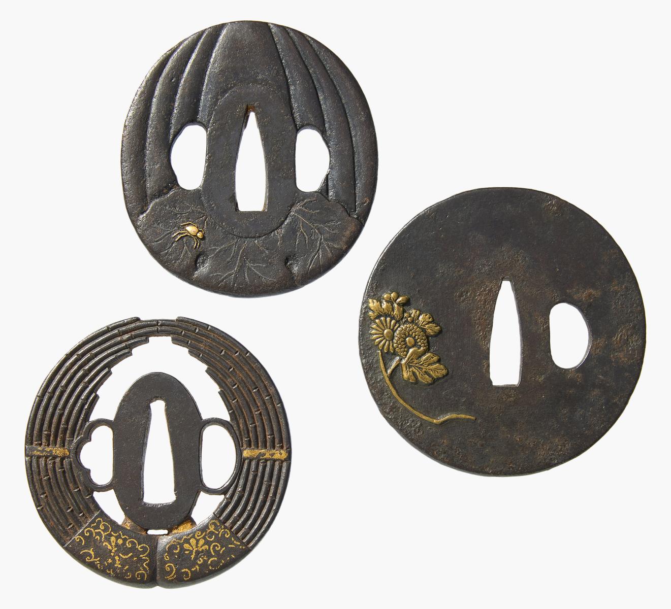 DREI TSUBA. CHRYSANTHEMEN, KÜRBIS UND SHÔ. EISEN.