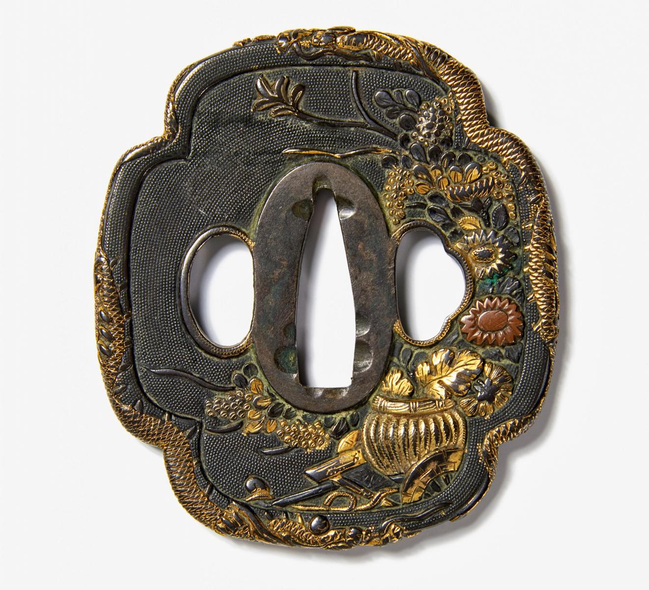 Technik: Shakudo/Kupfer mit Details in Gold.