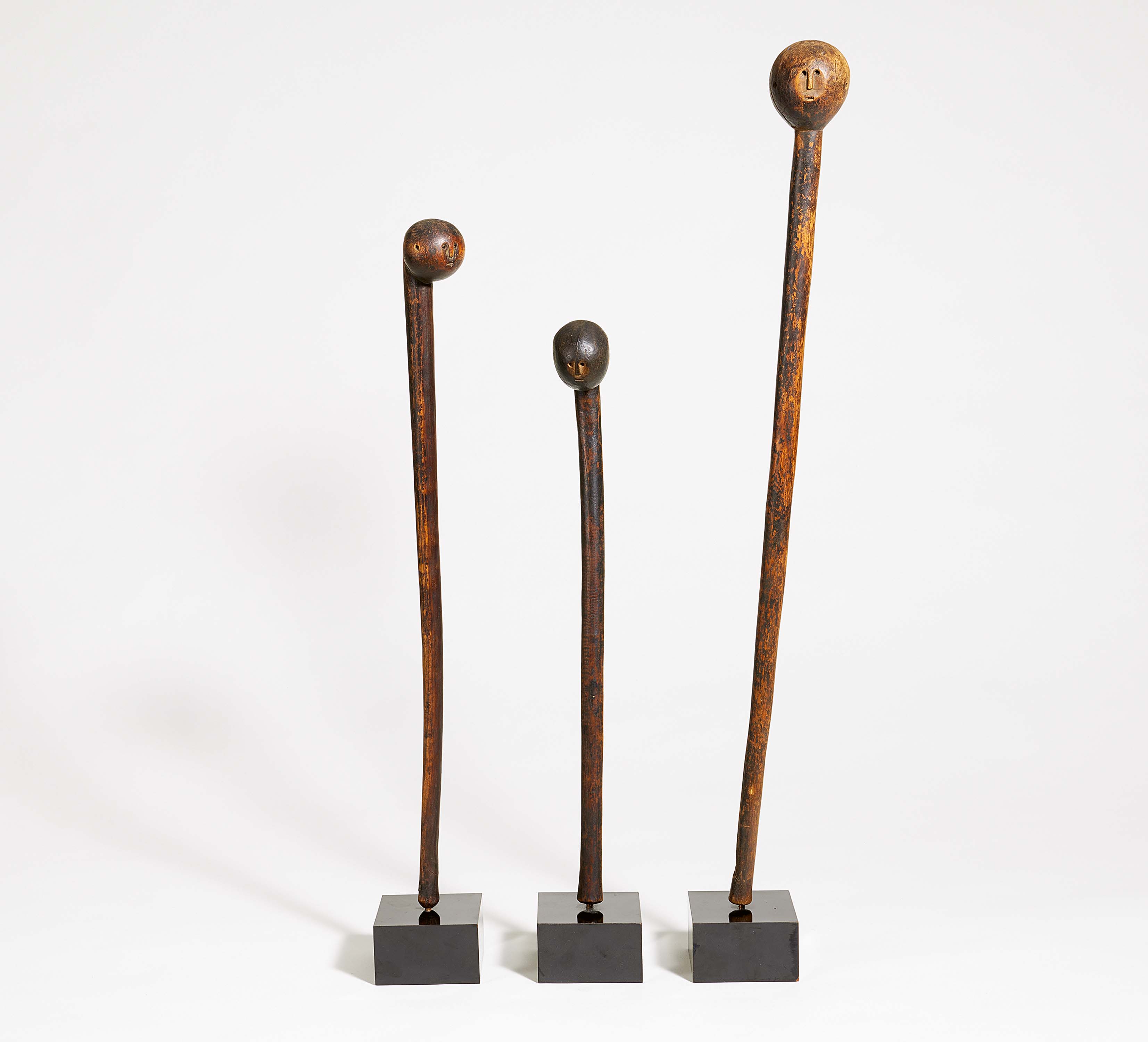 Beschreibung: Die drei Exemplare mit ihrer rotbraunen Patina zeigen auf dem Keulenkopf sehr reduzierte