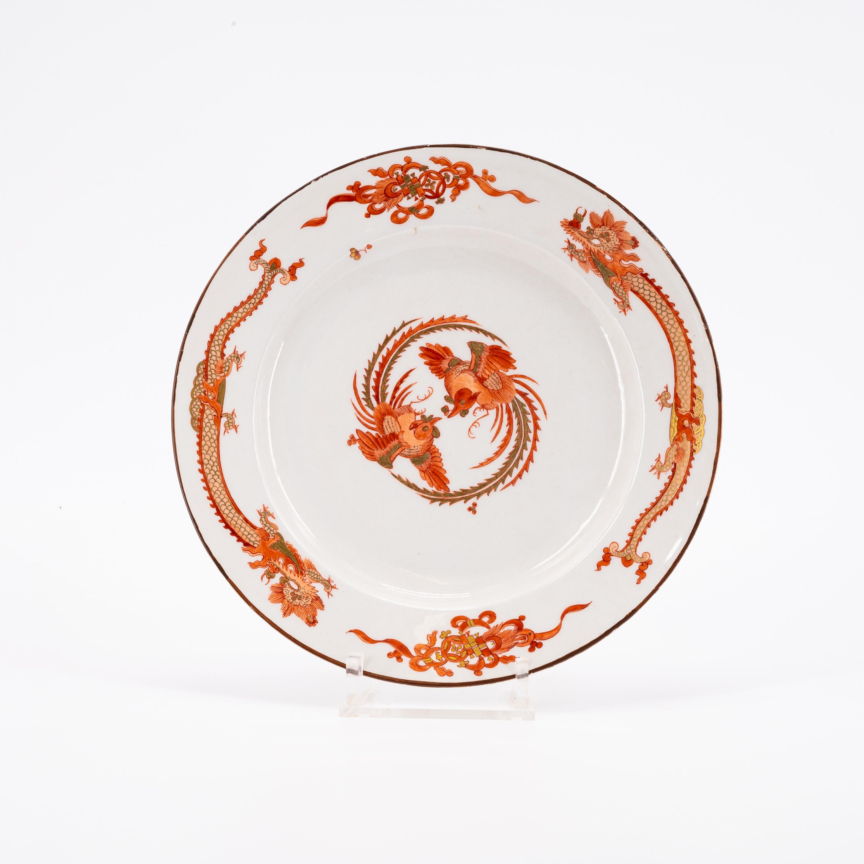 DREITEILIGES SCHREIBSET, SPEISETELLER UND TEETASSE MIT DEKOR "ROTER DRACHE".