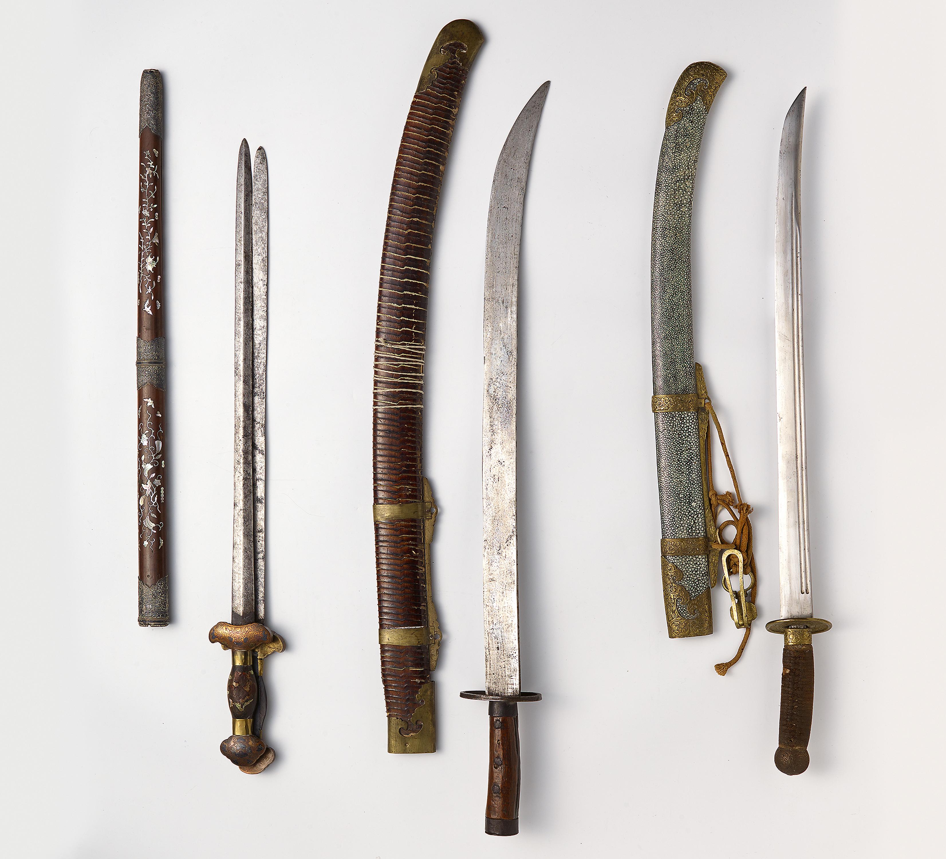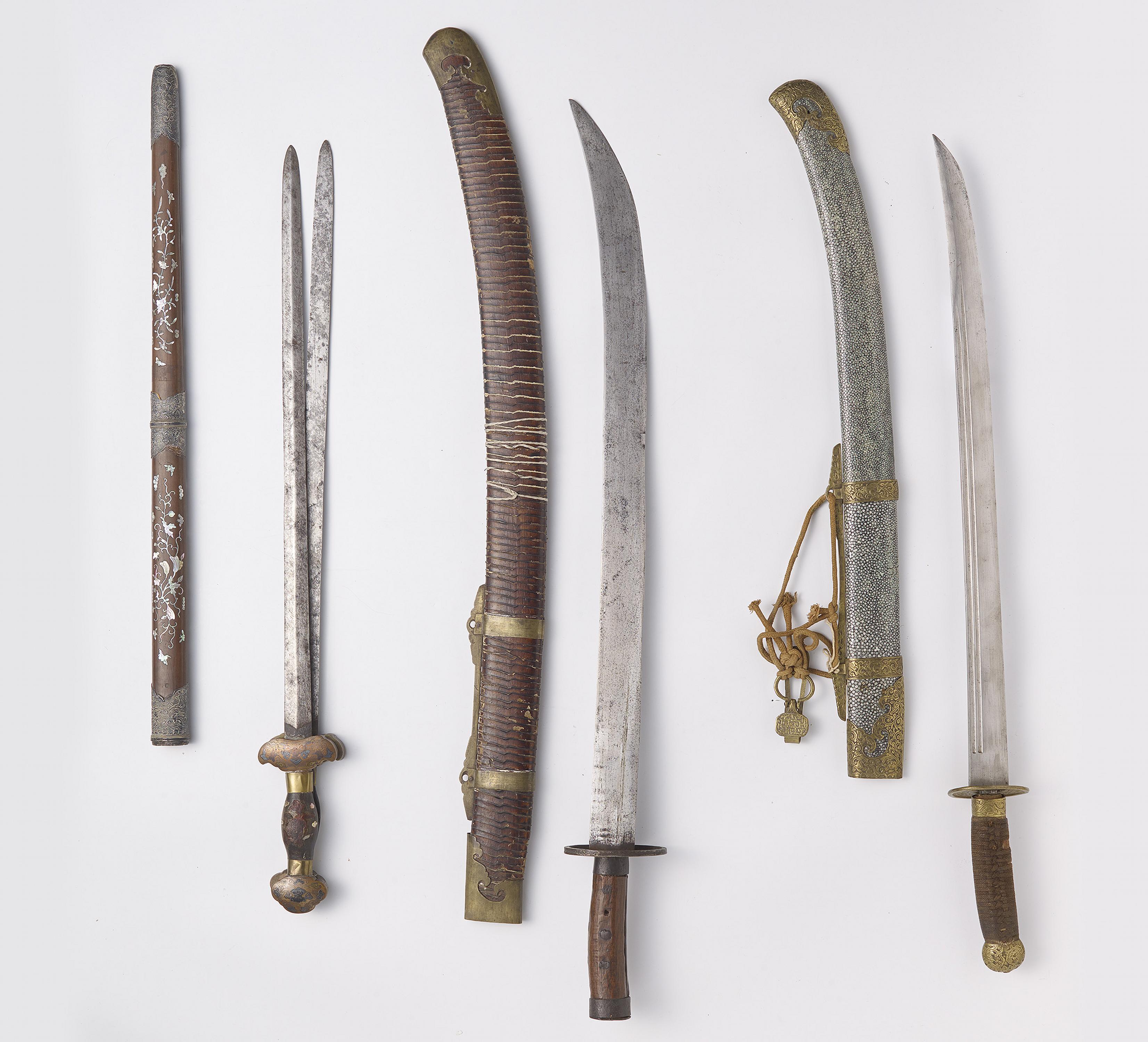 mit Draht umwickelt und lackiert. L.96cm, Klinge L.68cm. c) Liuyedao-Schwert. Scheide mit