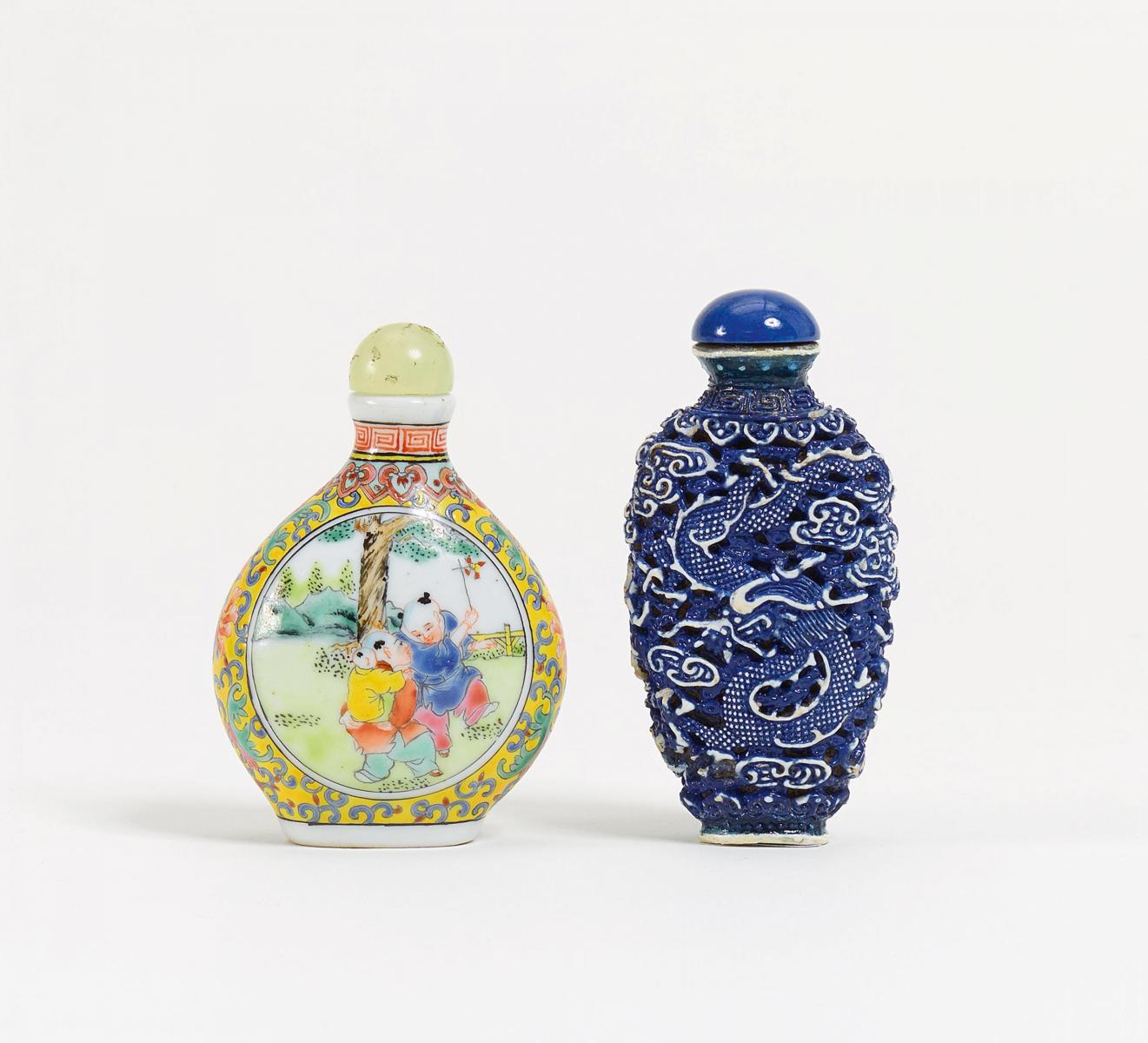 Zustand B. Am blauen Snuffbottle Hals restauriert.