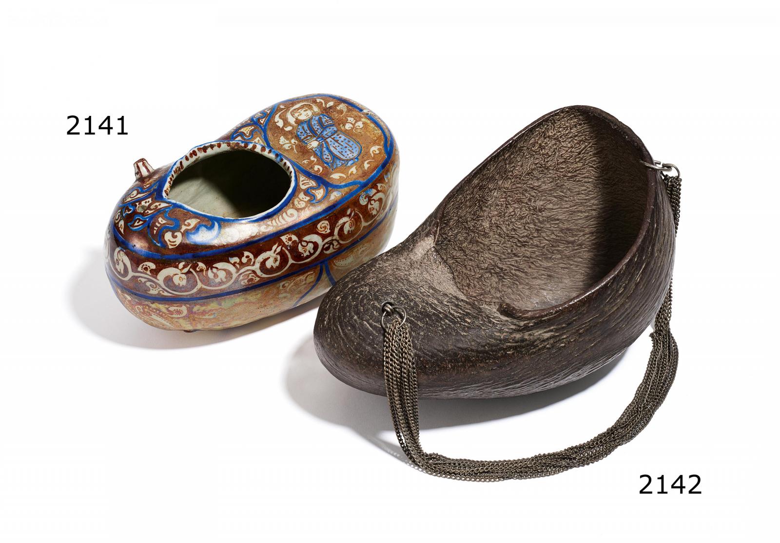 Beschreibung: Bauchige Form mit weiter, tropfenförmiger Öffnung und kleinem Ausguss. An beiden Seiten Löcher zur Befestigung einer Trageschnur. Die leichte Biegung der Form bezieht sich auf Gefäße aus einer halbierten Seychellen-Nuss. In mehreren Blatt- und Mirab-förmigen Kartuschen Sufi und Tiere der Jagd zwischen floralen Ranken. Eine umlaufende Bordüre mit Ranken, die in Hasenköpfen enden.