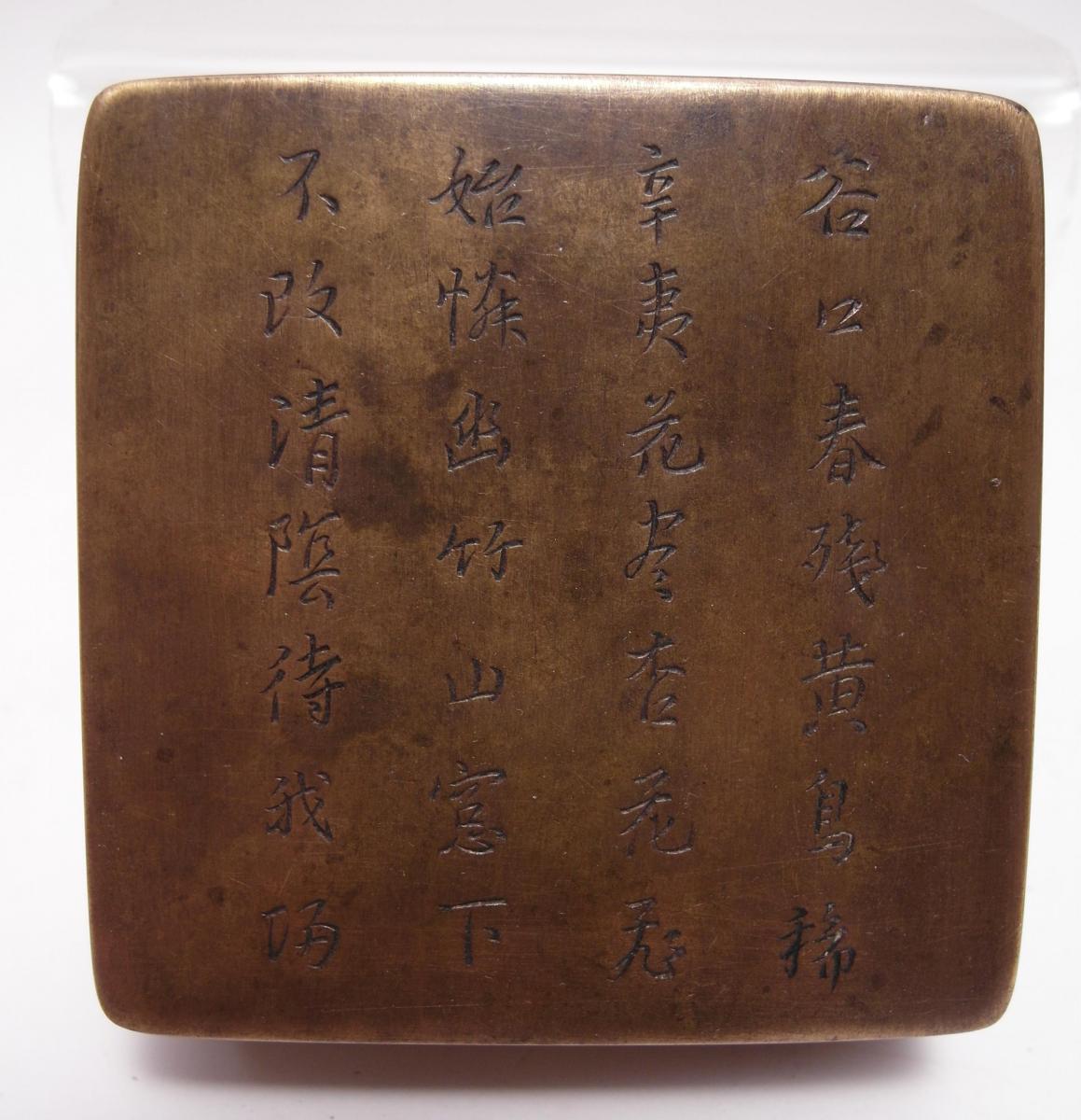 Zustand A/B. Beilage: Quadratische Dose mit graviertem Gedicht. Gelbliche Paktong-Bronze. China. Republik-Zeit. H.2,7cm, 7,2x7,1cm. Zustand A/B.