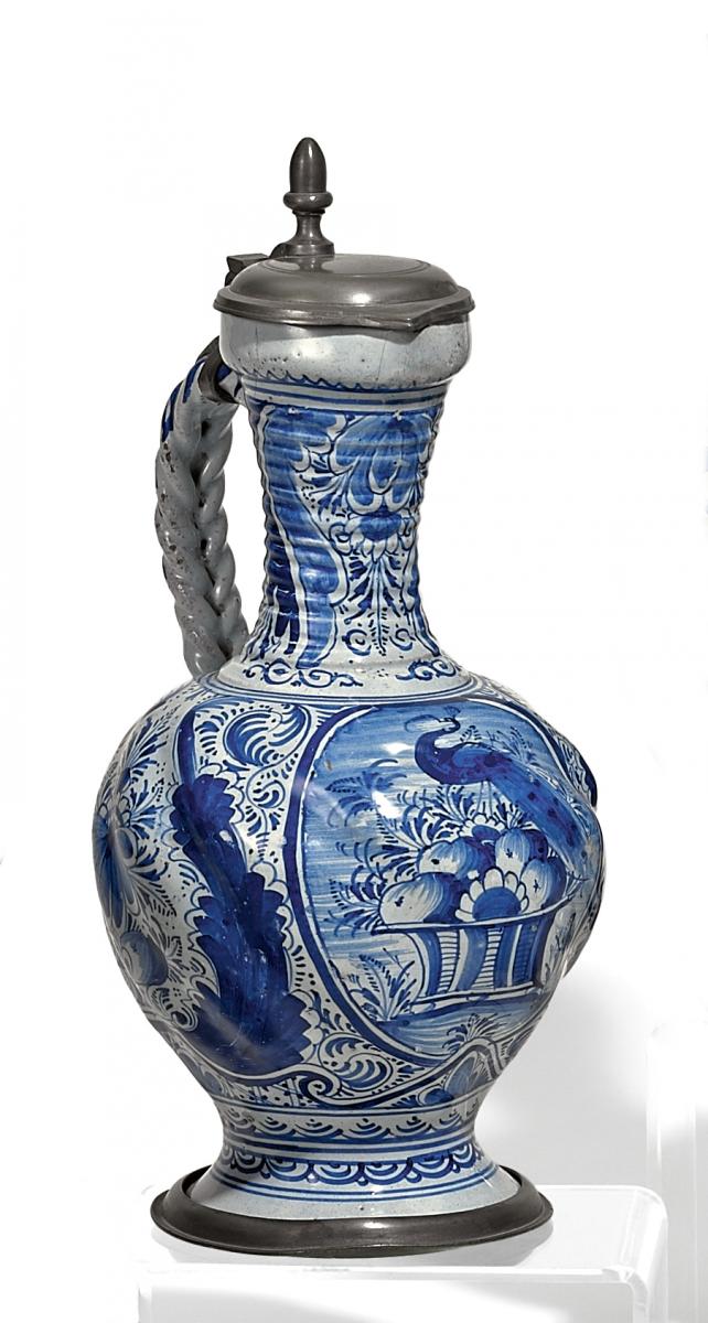 Beiger Scherben mit kleisterblauer Glasur und blauem Dekor. Zinnmontierung. H.31 cm. Zustand B.