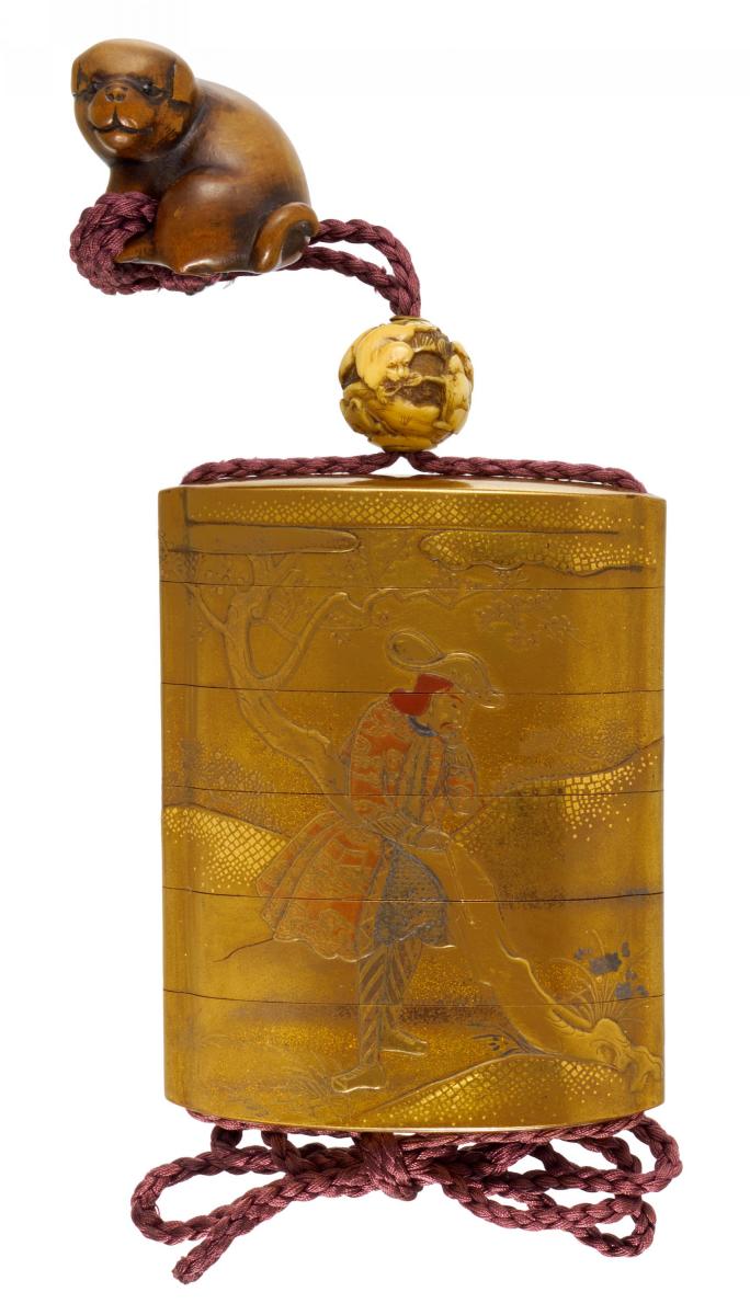 Beschreibung: Sechsteilig mit abgesetzter Schnurführung. Auf der Vorderseite ein Holländer, gekleidet in Gehrock, Bundhose und großem Hut. Er lehnt nachdenklich an einen Pflaumenbaum, in der rechten Hand hält er eine lange Pfeife. Auf der Rückseite ein weiterer Pflaumenbaum unter dem vier Hunde tollen. Gewicht 104g, Höhe 9,1cm. Sign. auf dem Boden: Koma Kansai saku, vgl. Wrangham S. 140 ff. Netsuke: Sitzendes Hündchen. Buchsbaum, Augen eingelegt aus dunklem Horn. Höhe 3,1cm. Ojime: Tollende Hunde in Landschaft. Elfenbein. Höhe 2cm. Sign.: Yukikazu, vgl. LA S. 1252.
