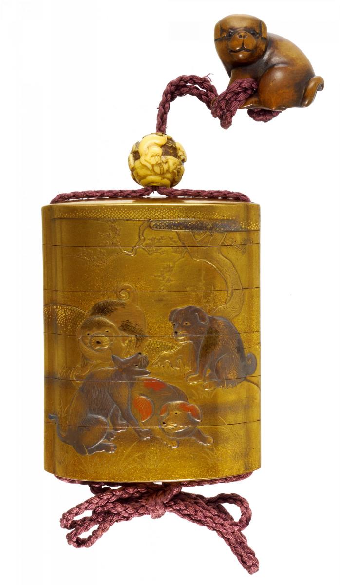 EXQUISITES INRÔ MIT HOLLÄNDER UND HUNDEN.