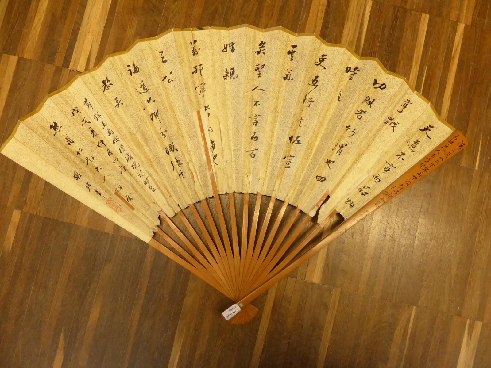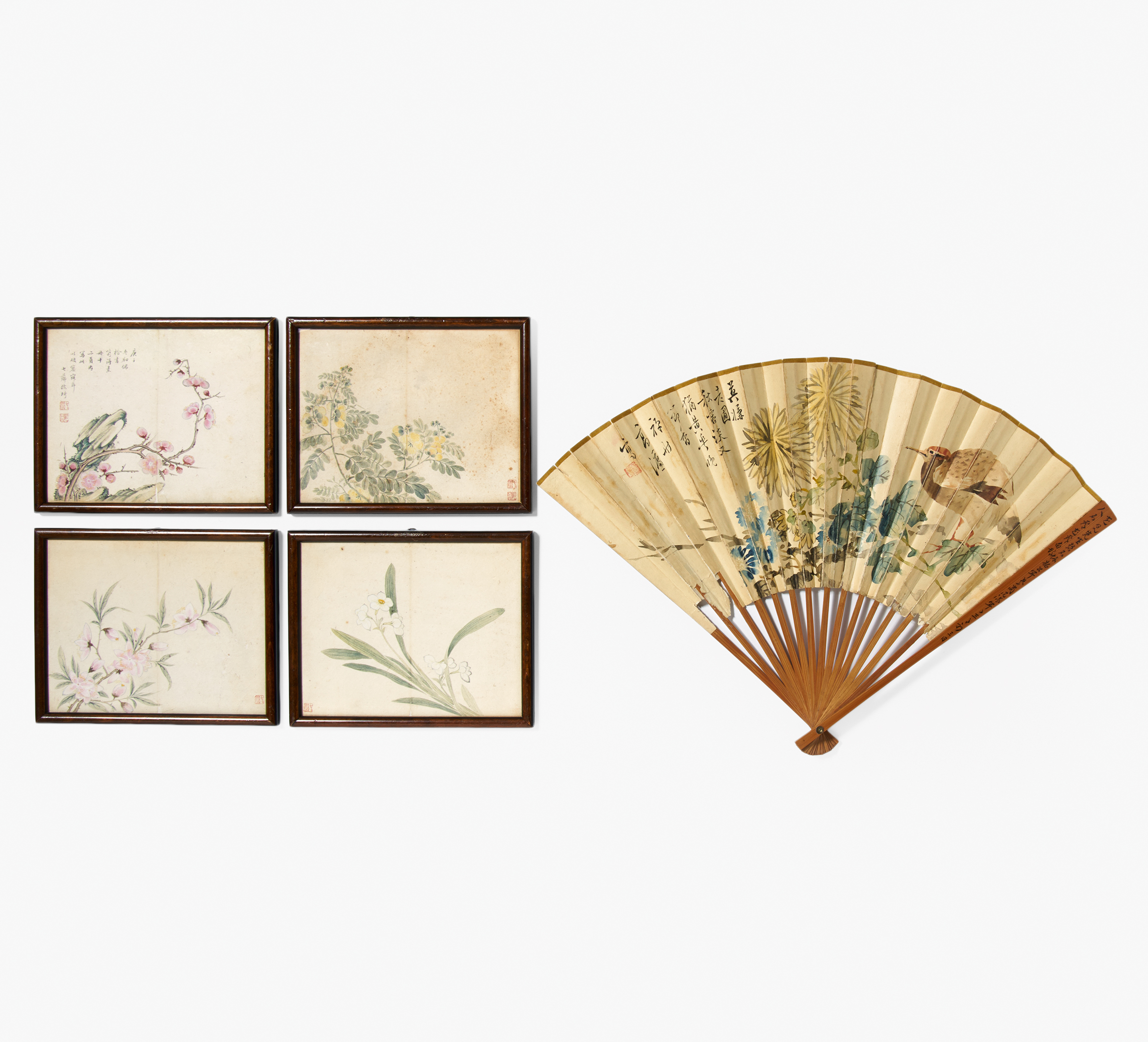50x18,5cm. Fächer L.32cm. Sign.: Gao ? und Hu Tingzhang. Beschädigt. b) Vier gerahmte
