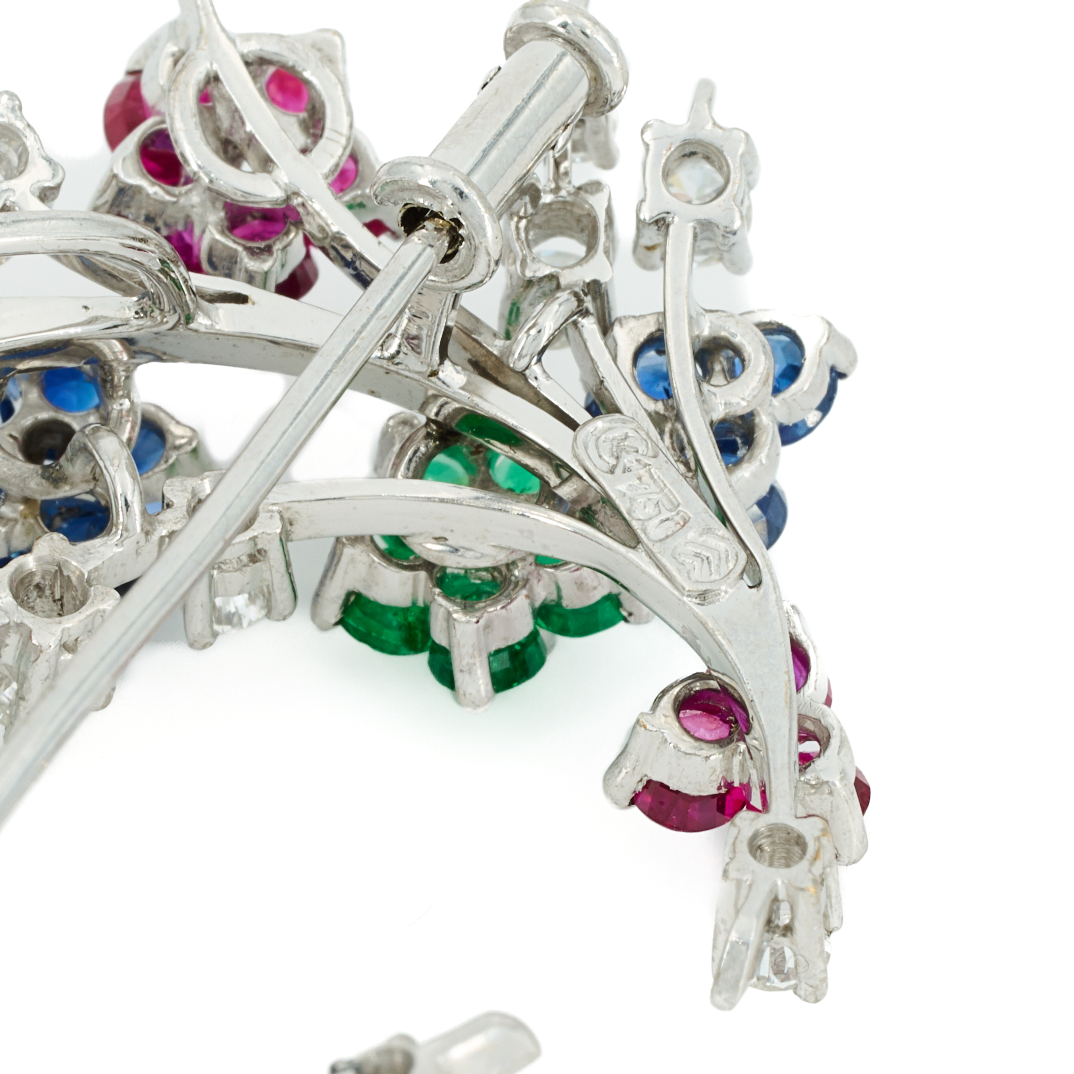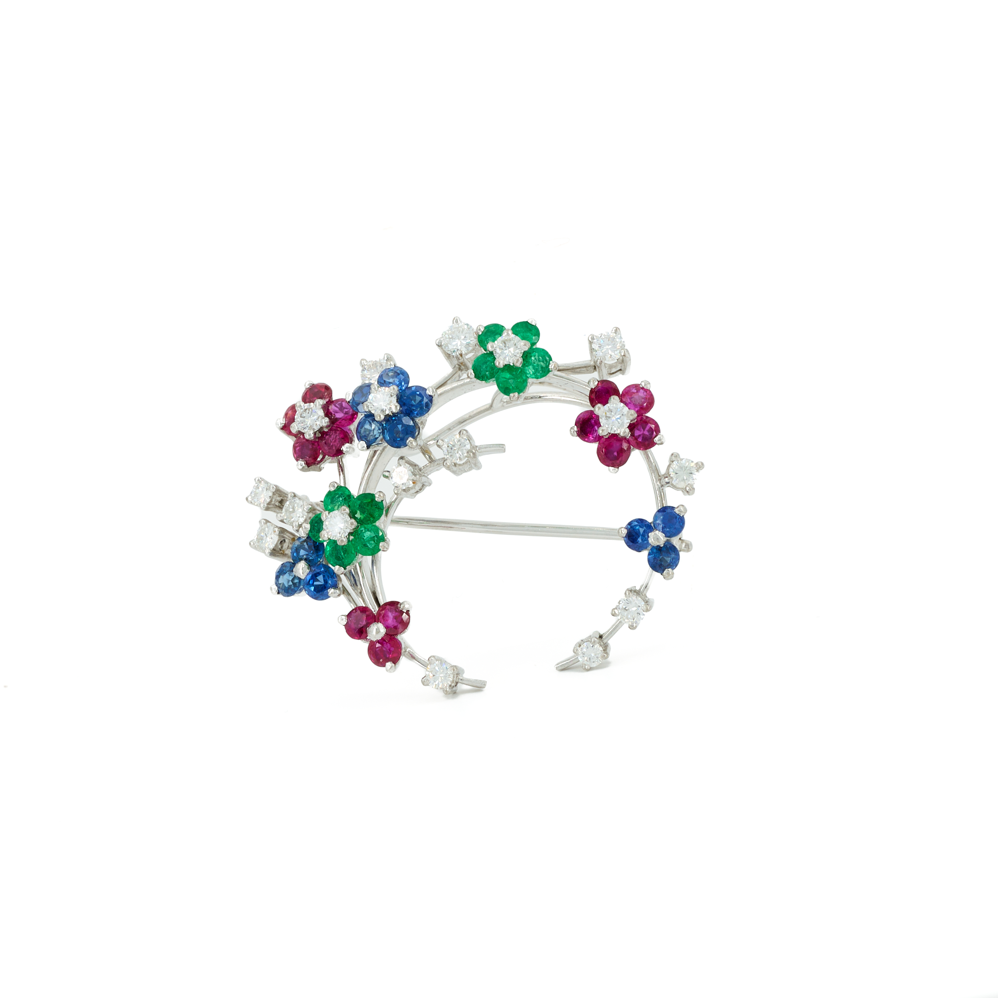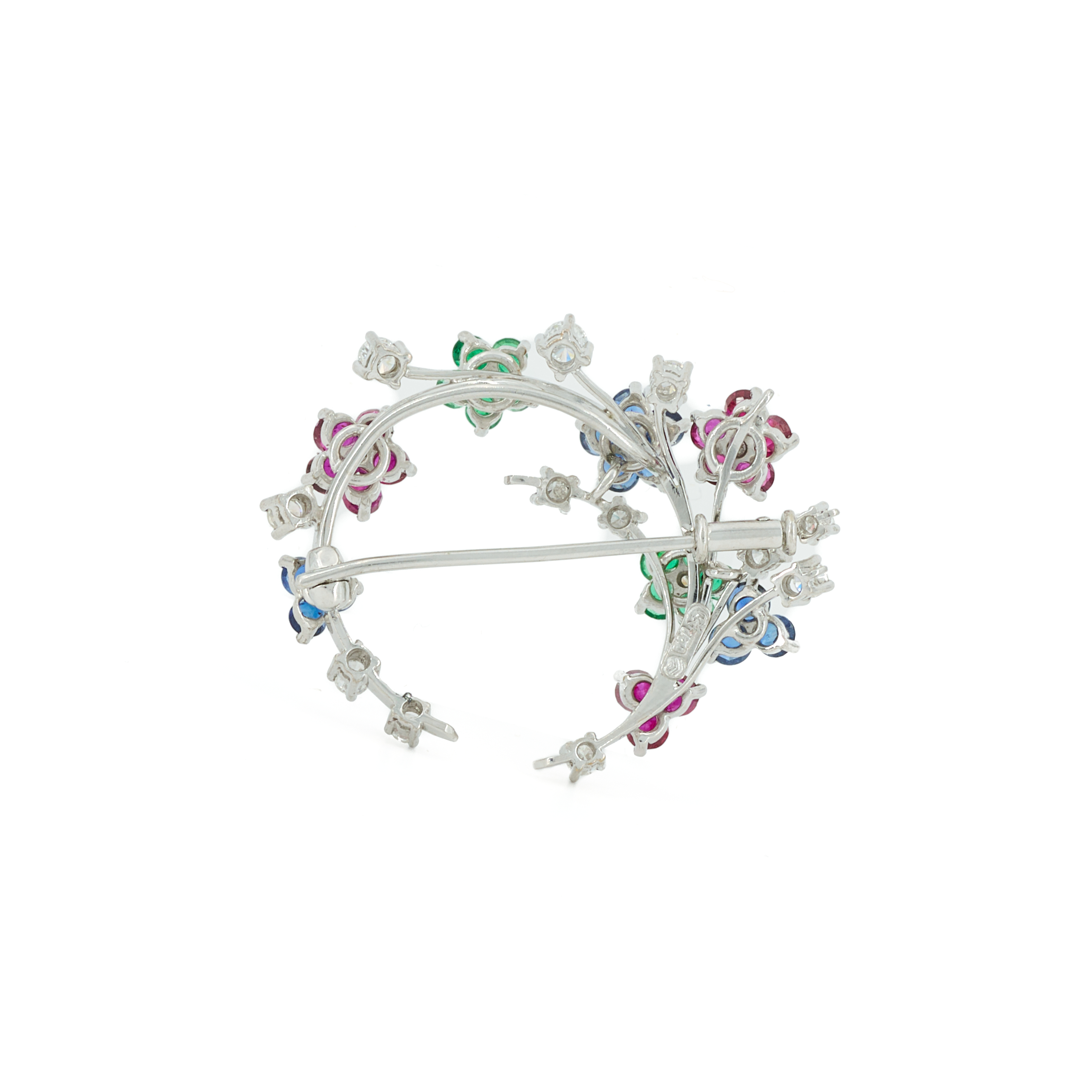 Edelsteine: 10 runde, facettierte Smaragde zus. ca. 0.55 ct., 13 runde, facettierte Rubine zus. ca. 1,43 ct., 11 runde, facettierte Saphire zus. ca. 1,32 ct.