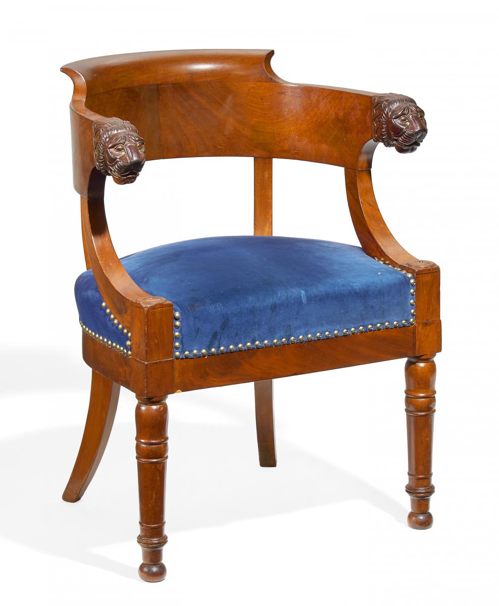 Mahagoni poliert und tlw. geschnitzt. Gepolstert. Halbrunde Rückenlehne, in Löwenköpfen endend. Höhe 78 cm. Zustand C.