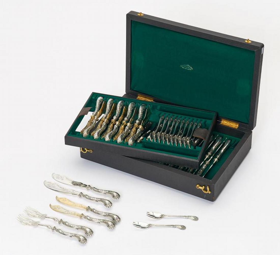 Silber, partiell vergoldet. 12 Personen. Insg. 48 Teile, best. aus 12 Fischgabeln, 12 Fischmessern, 12 Austernmessern,