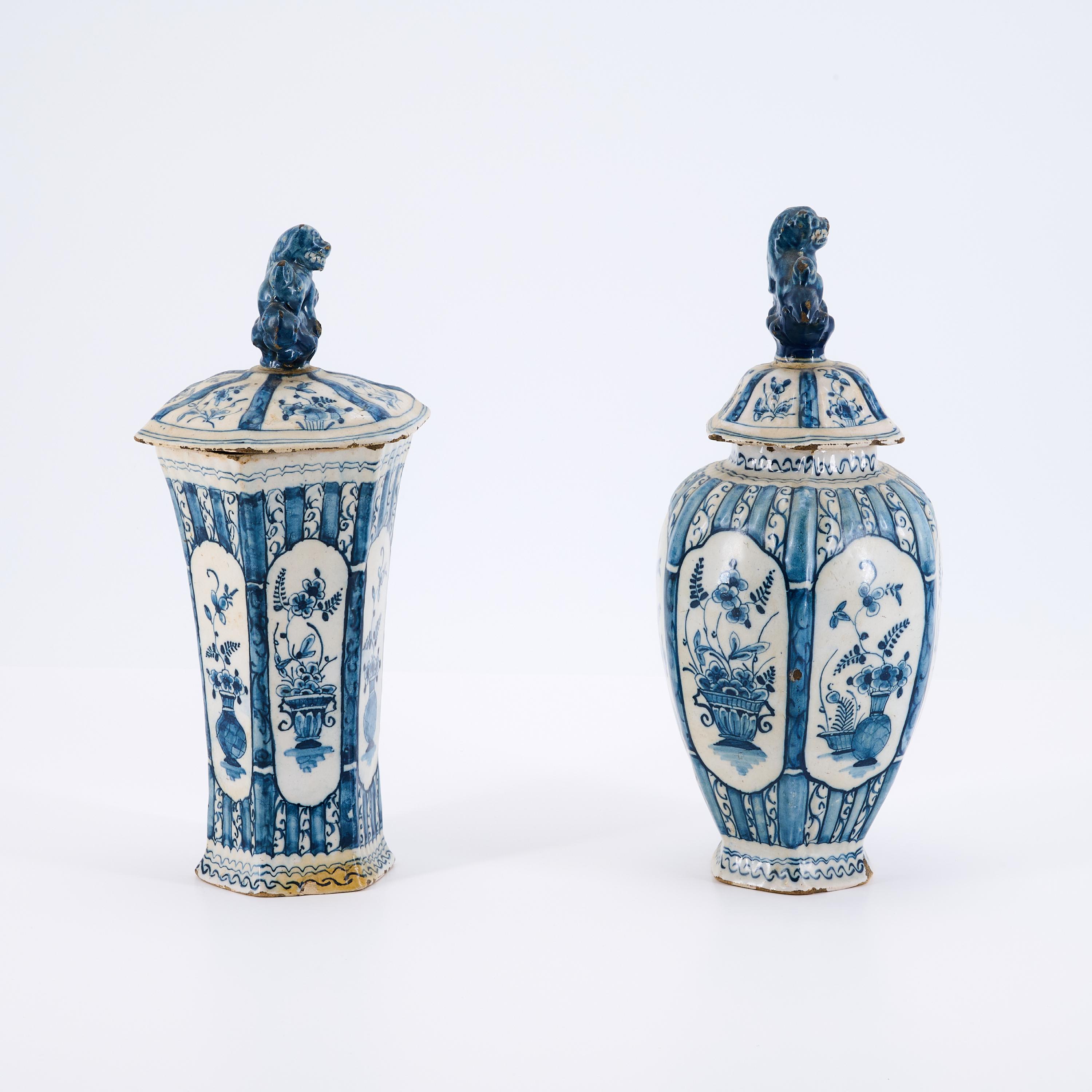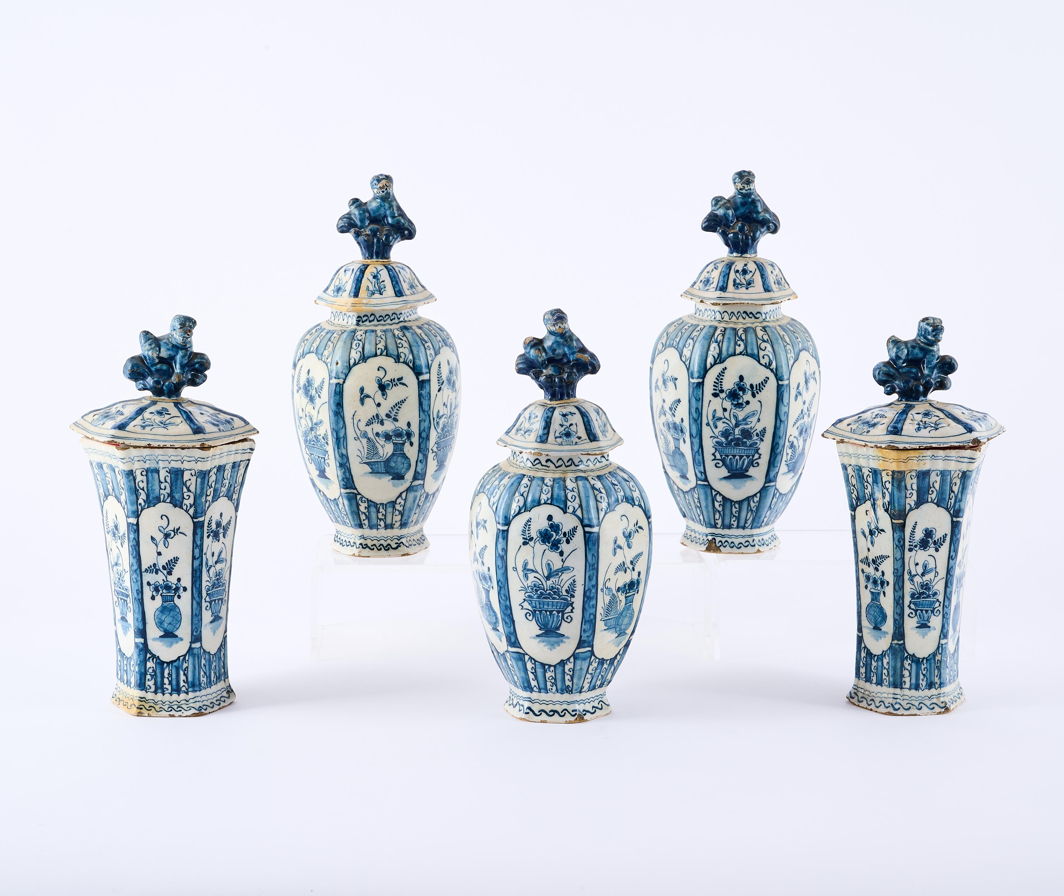 FOLGE VON FÜNF DECKELVASEN MIT PLASTISCHEN LÖWEN ALS KNAUF