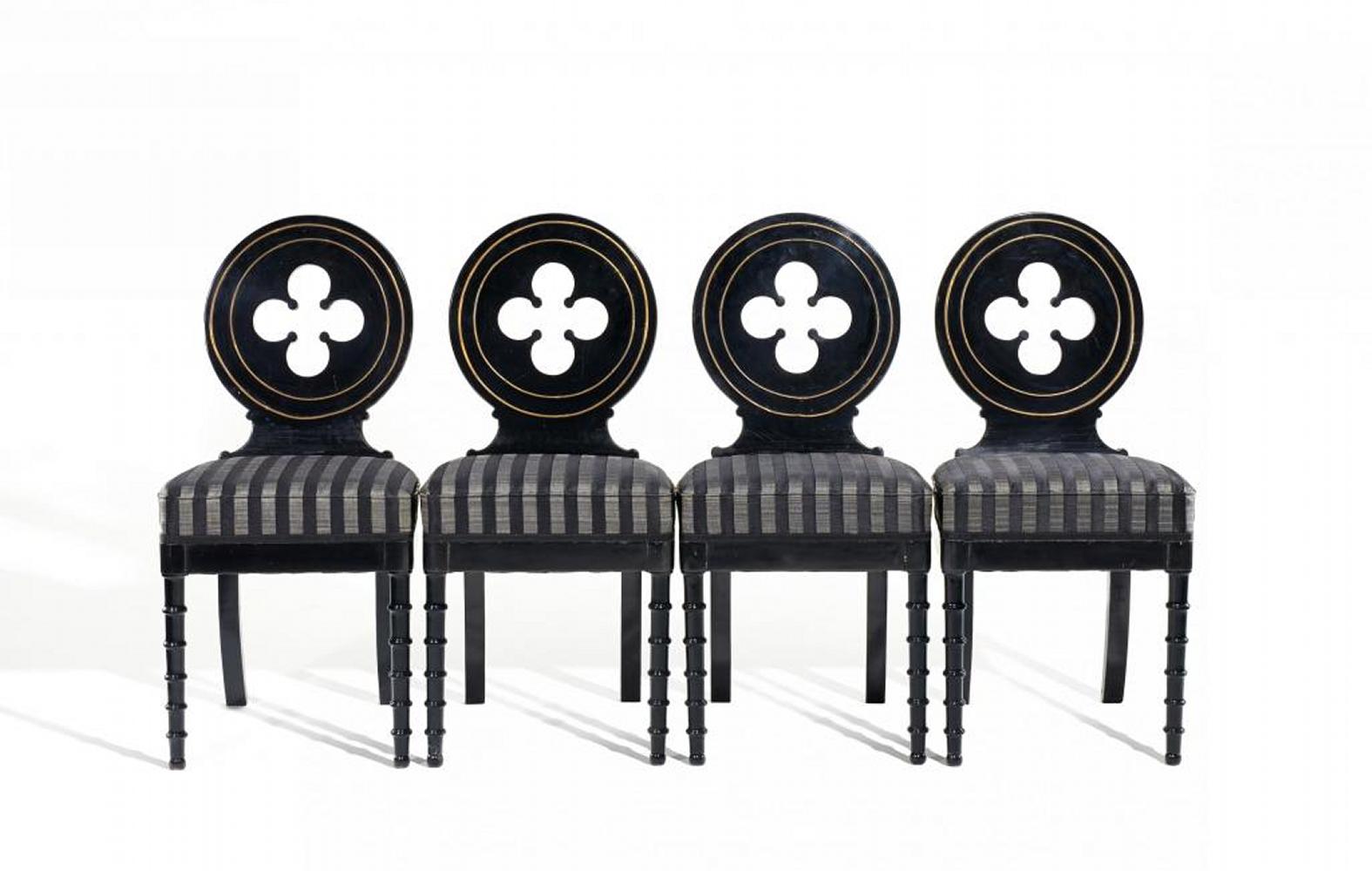 Obstholz ebonisiert. Messingleisten. Gepolstert. Gedrechselte Vorderbeine. Runde Rückenlehnen mit Vierpässen. Höhe 88 cm. Zustand B.