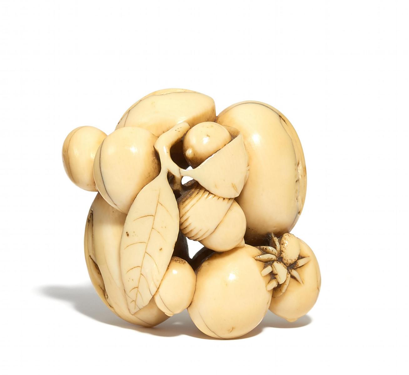 Technik: Elfenbein, fein geschnitzt und graviert, schöne, gold-gelbe Gebrauchspatina.