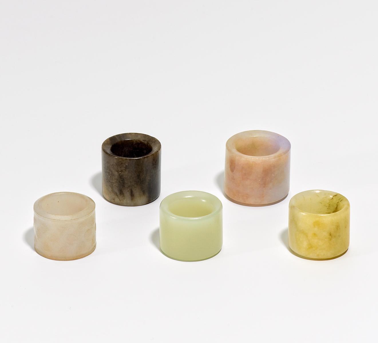 Technik: Jade: hellgrau, grau mit lavendel, grau mit Reiskorn-Relief, grau-beige gewölkt, grau-schwarz-braun gewölkt.