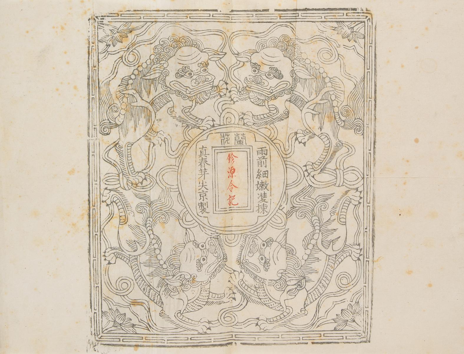 Technik: Farbdrucke mit bis zu drei Farben (Schwarz, Rot, Blau) auf Papier aus Bambus bzw. Maulbeerbaum, teilweise mit Tusche handbeschrieben.