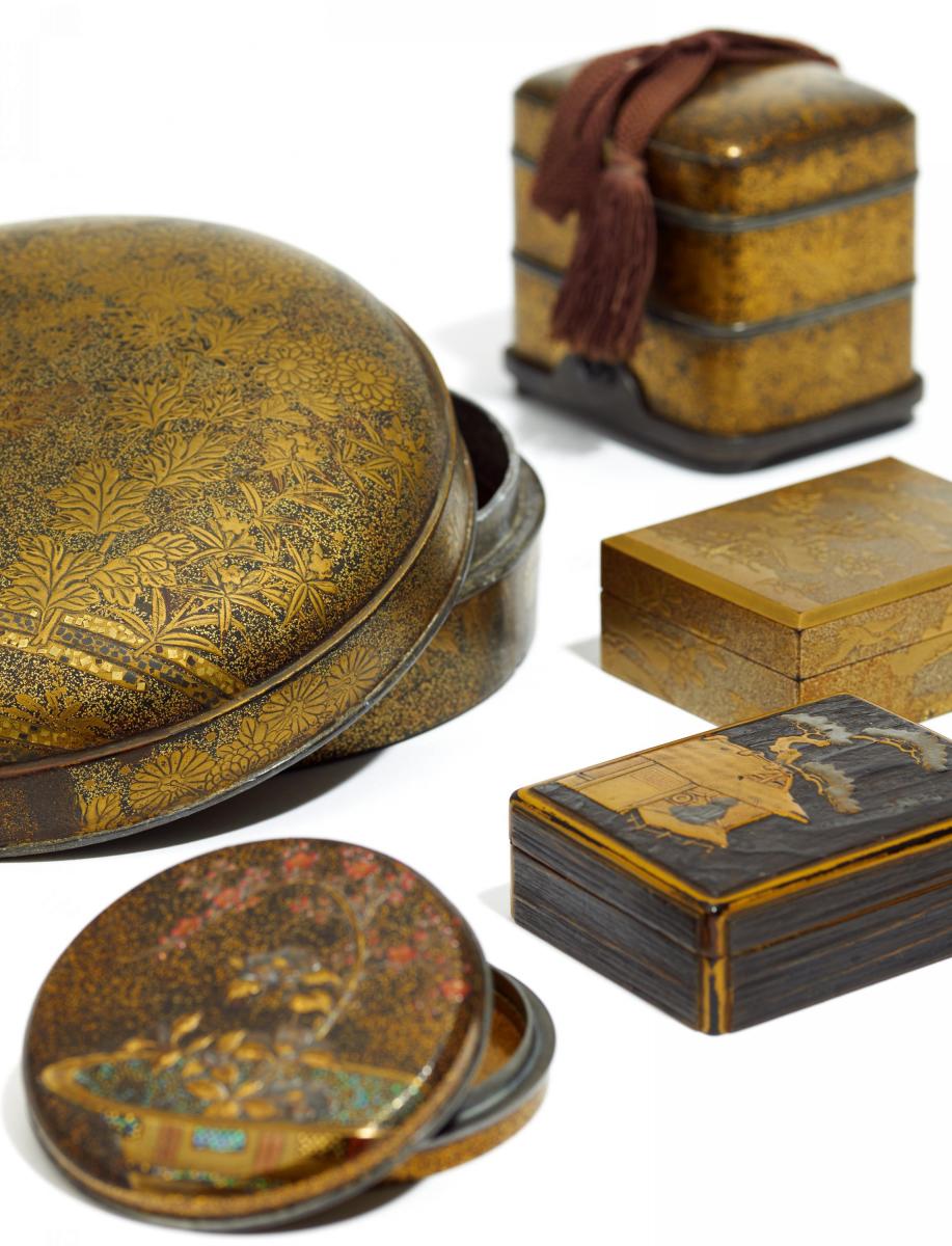 Beschreibung: a) Große runde Dose (tebako) aus einem Hochzeitsset. Auf nashiji-Grund in Gold-hiramaki-e mit gyôbu Chrysanthemen und andere Blumen. Höhe 6,5cm, Ø 16cm. b) Dreiteilige Dose für Räucherwerk. Auf nashiji-Grund in hiramaki-e Blütenranken. 7,5 x 8,3 x 6,5cm. c) Runde Dose für Räucherwerk. Auf nashiji-Grund in takamaki-e mit aogai-gyôbu Ikebana mit Pflaumenblüten und Kamelien. Ø 7,5cm. d) Rechteckige Räucherwerk-Dose. Auf nashiji-Grund in Gold-hiramaki-e und mit gyôbu Kiefer, Kamelie, Kranich und minogame - Glückwünsche für ein langes Leben. 7,4 x 5,7cm, Höhe 2,4cm.