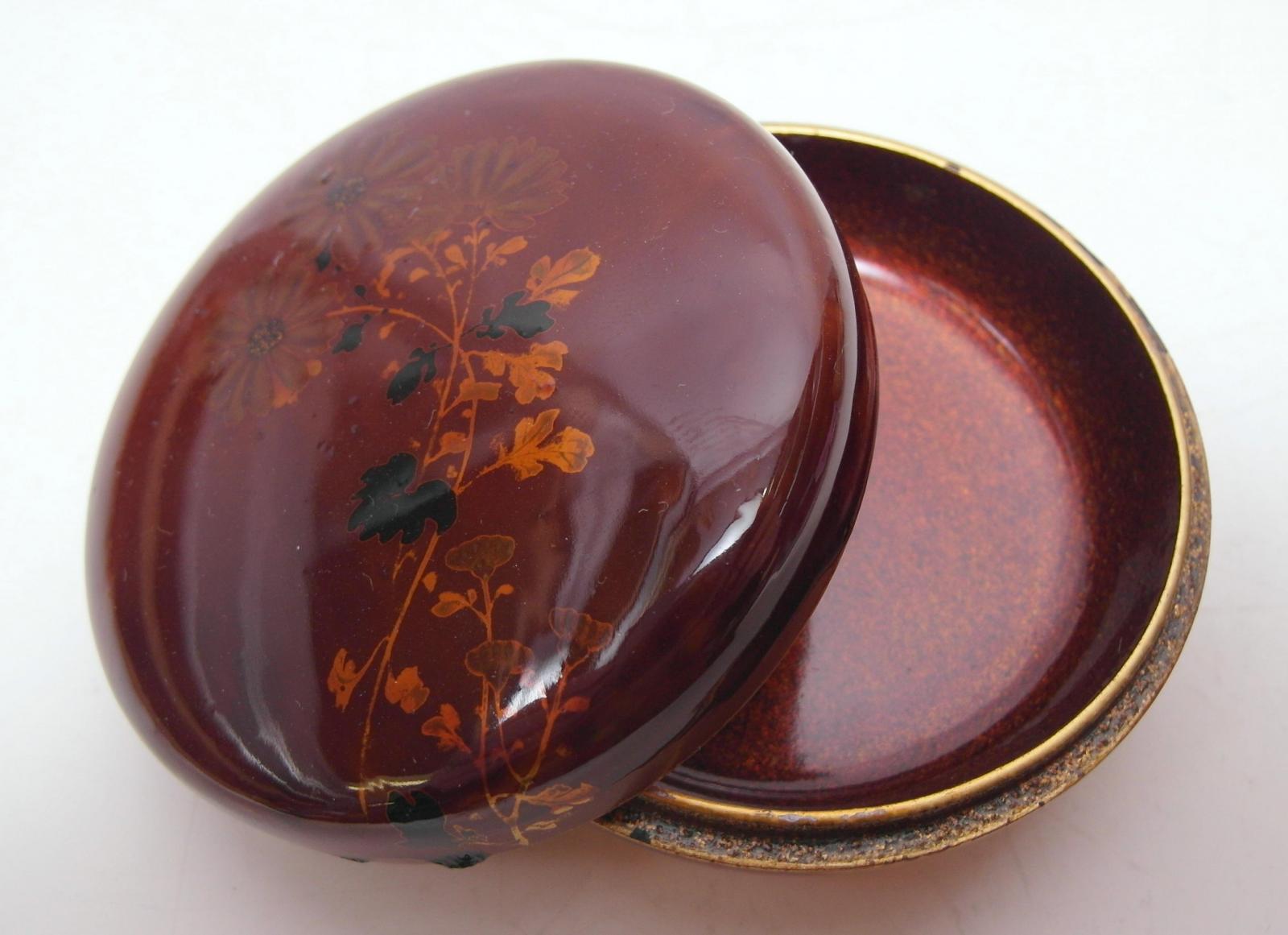 Zustand A/B. Beilage: Lackdose mit Chrysanthemen. Japan. 20. Jh. Ø 7,5cm. Zustand A/B.
