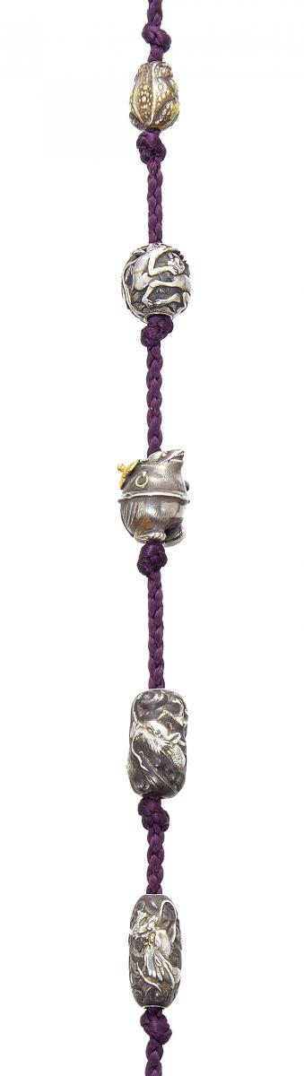 Beschreibung: A) Silber. In Form eines Kama, sich in ein Tanuki verwandelnd. B) Silber. Affen unter