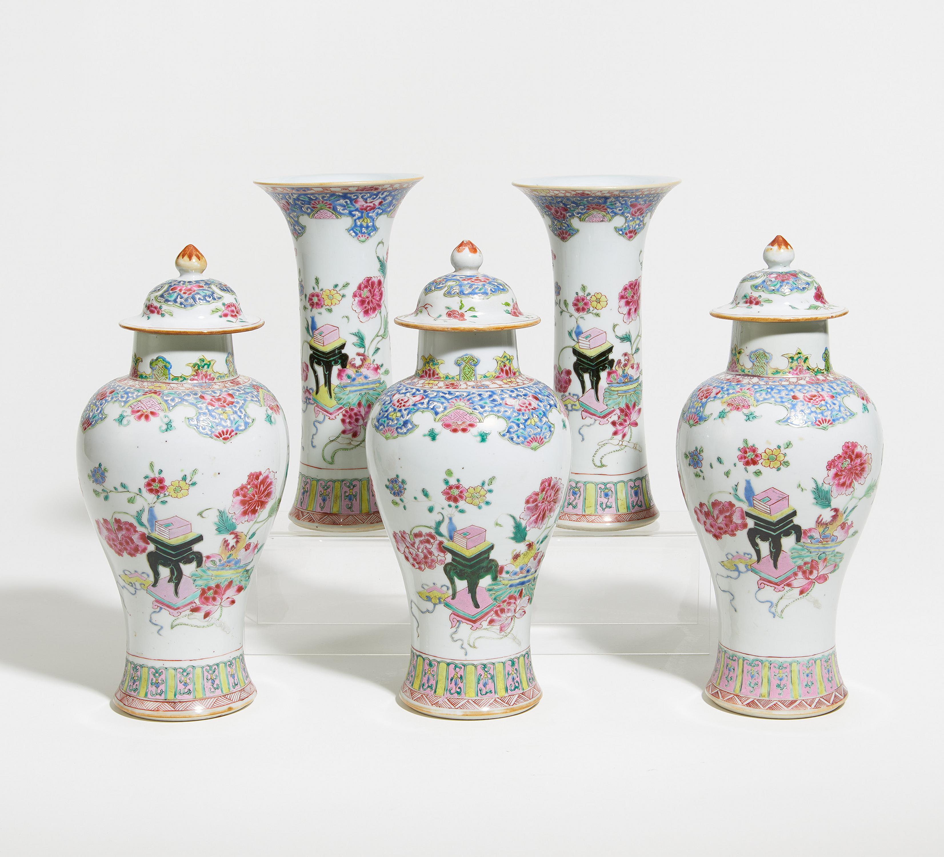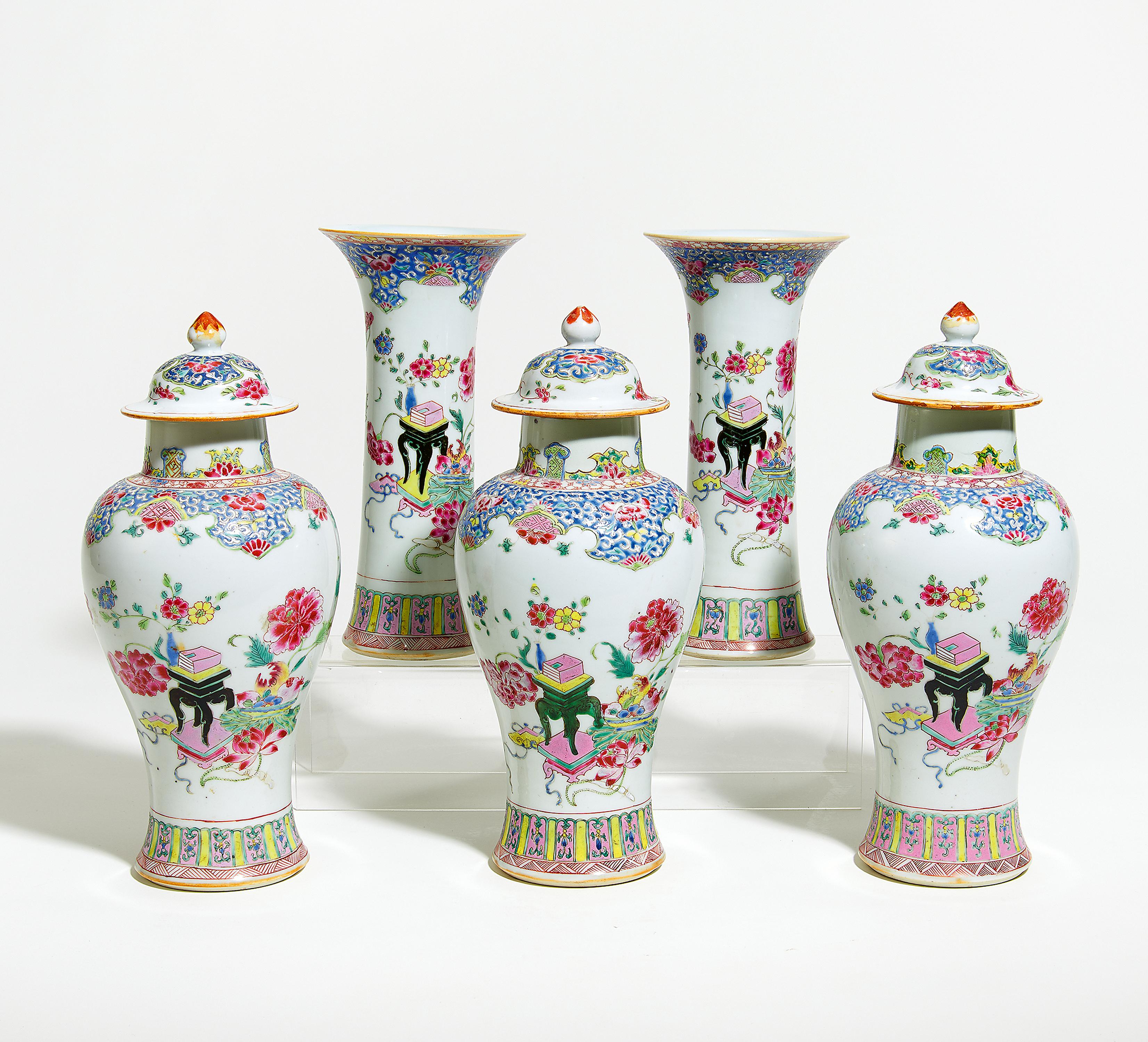 FÜNFTEILIGE VASEN-GARNITUR MIT ANTIQUITÄTEN UND BLÜTEN.
