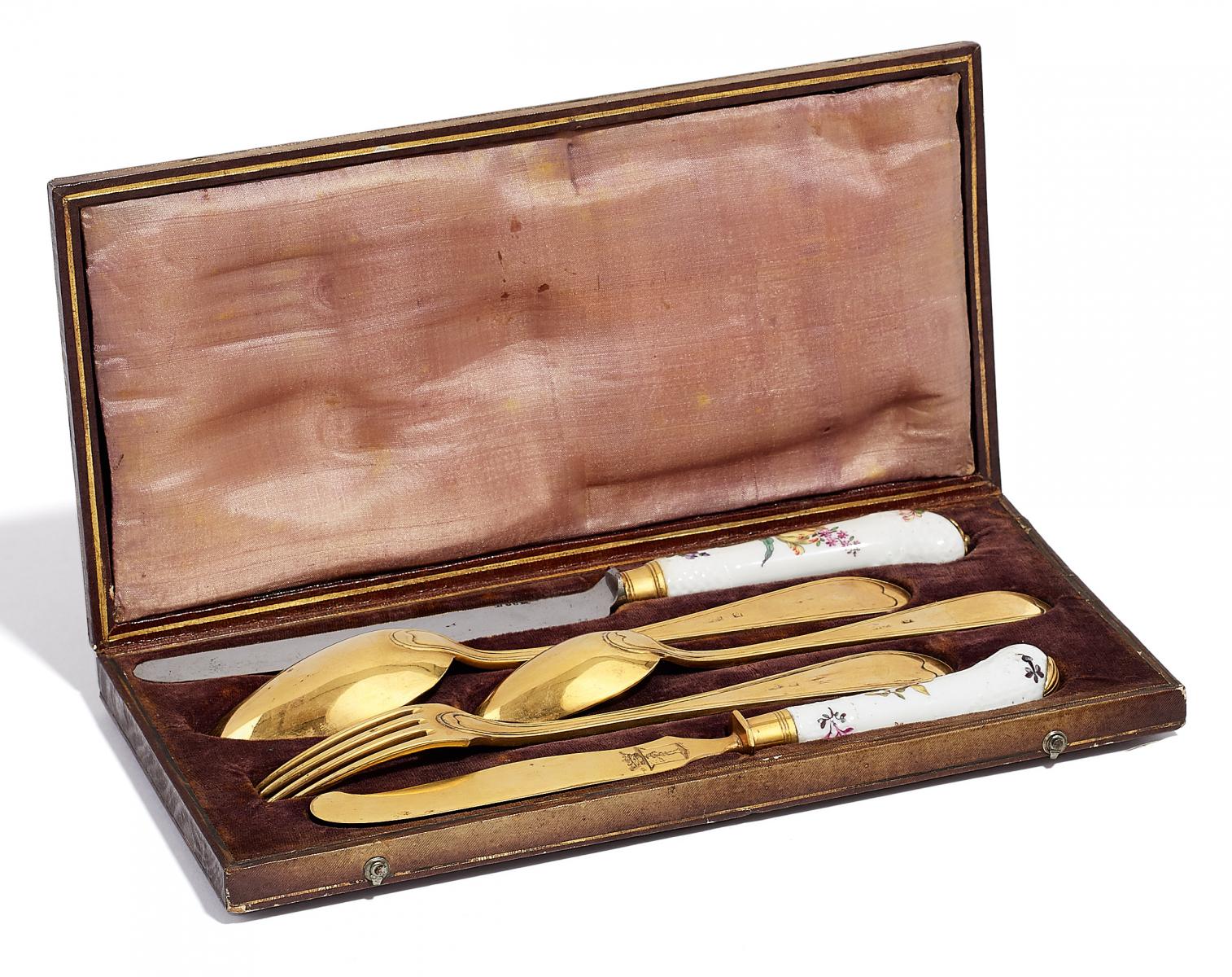 Silber, vergoldet. Zwei Porzellangriffe farbig staffiert, 1 Messer mit Stahlklinge. Bestehend aus je einem Speisemesser, Speiselöffel, Speisegabel, Dessertlöffel und