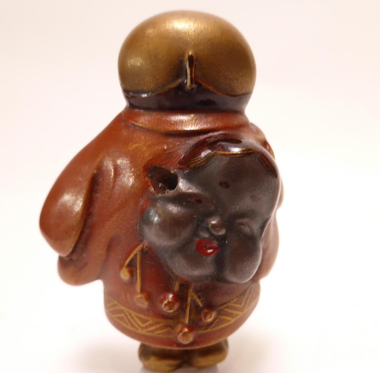 Beschreibung: Der Glückszwerg steht in zeremoniellem, weitärmeligem Gewand, die Maske mit Glöckchen auf