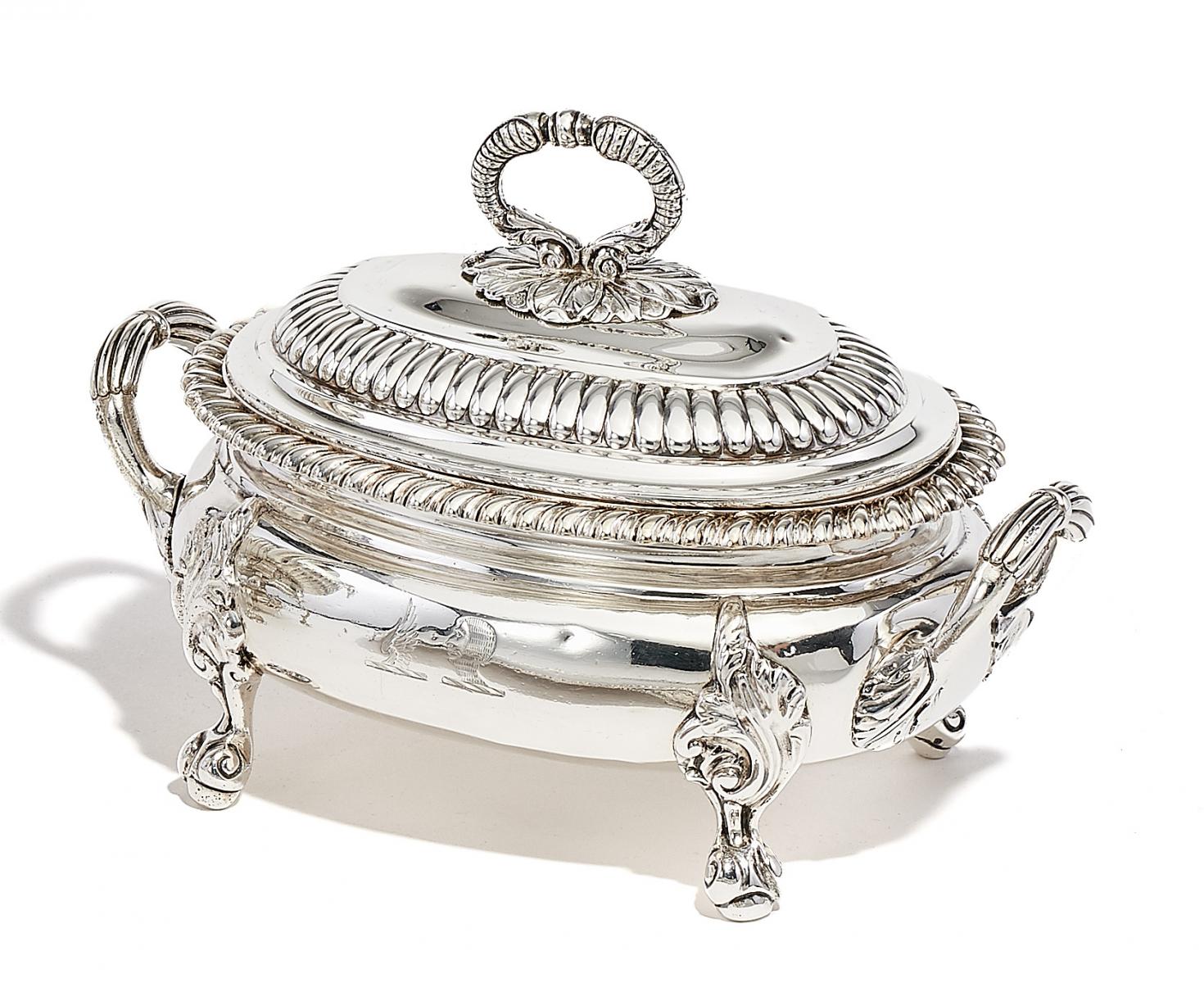 Silber. Auf der Wandung heraldische Gravur. Ca. 858g. Höhe 13,5 cm, Länge 20cm.