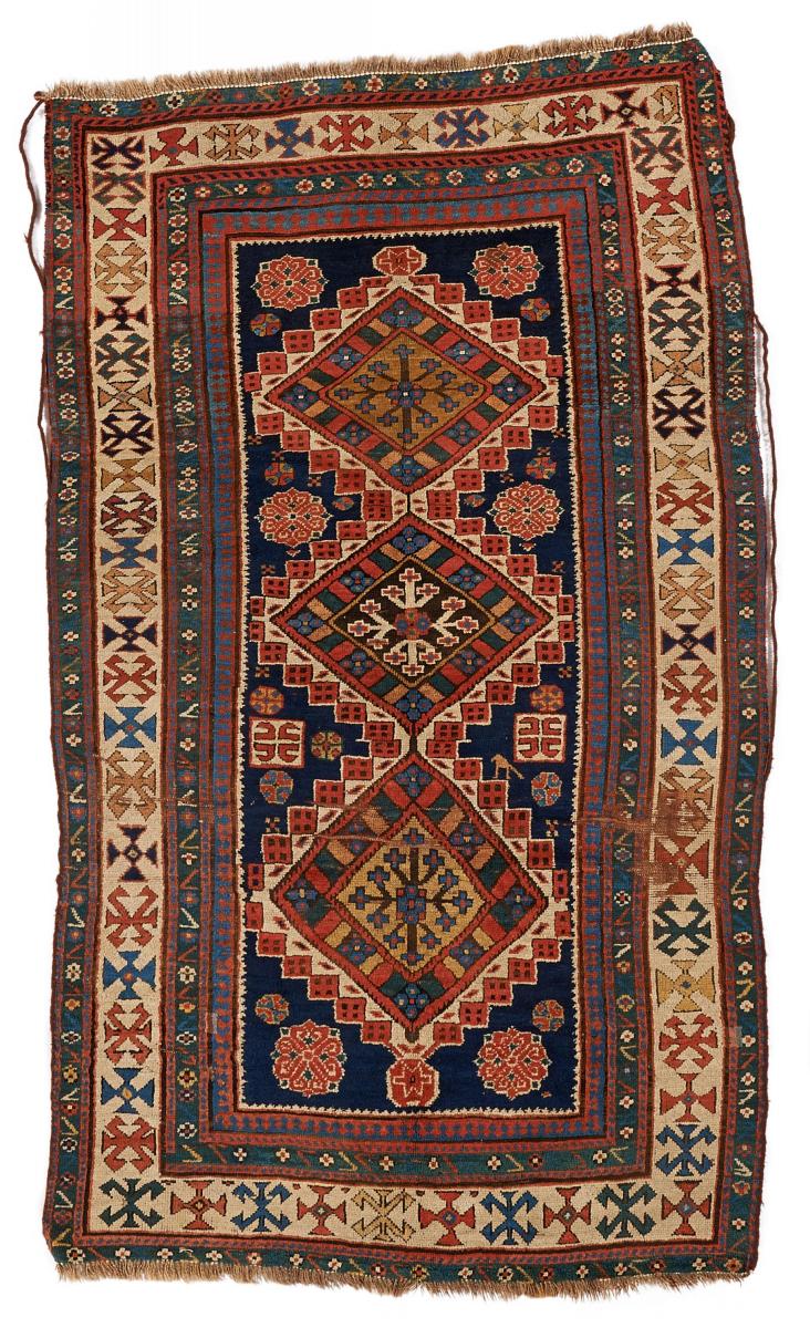 214 x 127cm. Zustand C/D. (Teilw. abgetreten, Enden verkürzt, Seitenkanten beschädigt, Trittfalten).